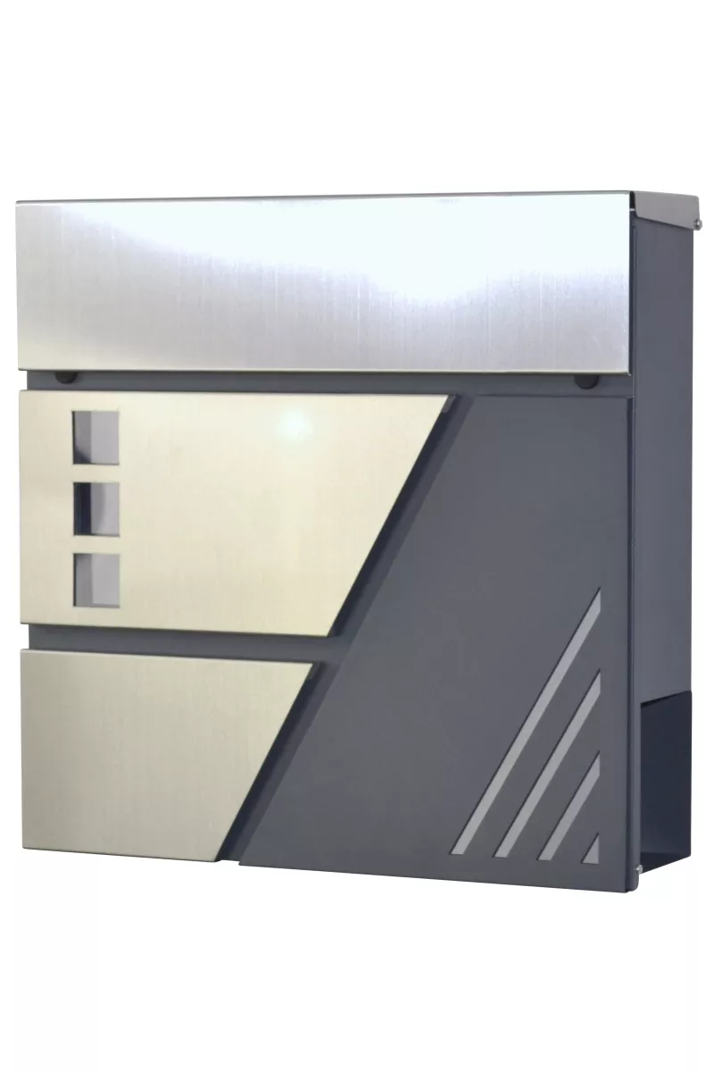 Dieser moderne Metallbriefkasten überzeugt durch sein elegantes Design und eine hochwertige Verarbeitung. Die zweifarbige Oberfläche in Edelstahloptik und Anthrazit, langlebig beschichtet, macht ihn zu einem stilvollen Blickfang an jeder Hauswand – perfekt für moderne Wohnhäuser und Eingangsbereiche.