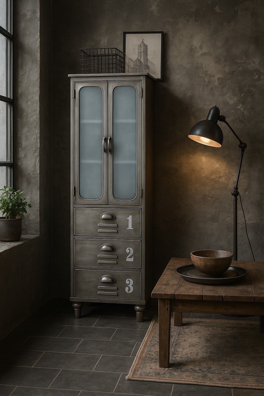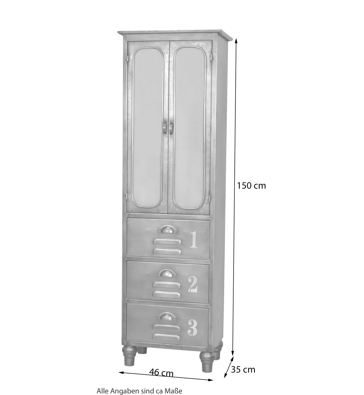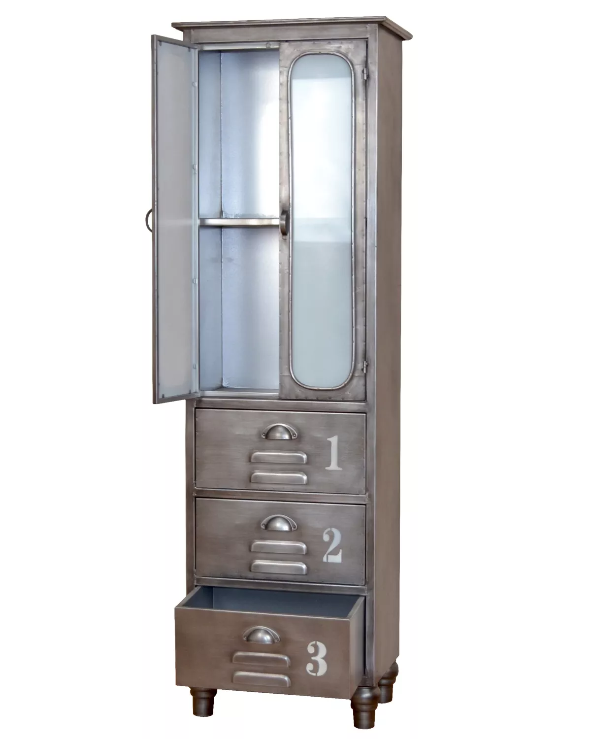Dieser Metallschrank mit 2 Glastüren und 3 Schubladen vereint urbanen Charme mit praktischer Aufbewahrung. Komplett aus Metall gefertigt und metallfarben lackiert, bringt er authentisches Industrie-Design in dein Zuhause. Die Sicherheits-Milchglaseinsätze und die nummerierten Schubladen verleihen dem Schrank einen einzigartigen Charakter – robust, markant und mit viel Geschichte im Look.