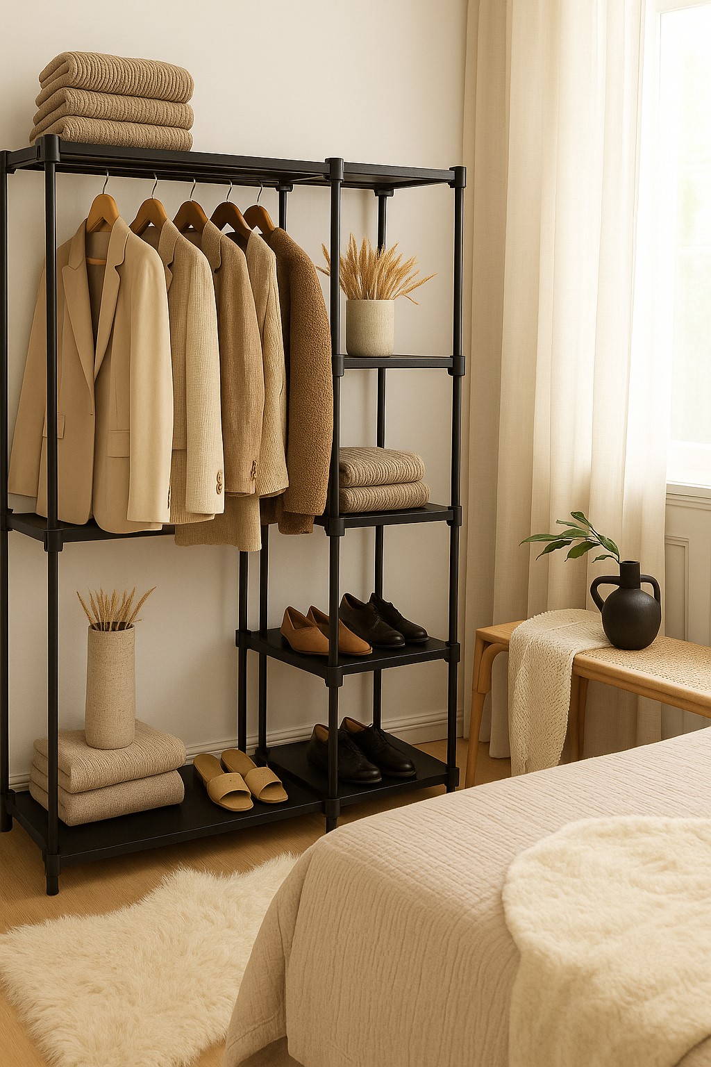 Dieser offene Kleiderschrank vereint Funktionalität, Design und Stabilität in einem modernen Möbelstück. Ob als Kleiderschrank, Garderobe im Flur oder Zusatzaufbewahrung im Schlafzimmer – dieses Möbel erfüllt alle Anforderungen an eine clevere und übersichtliche Aufbewahrungslösung.
