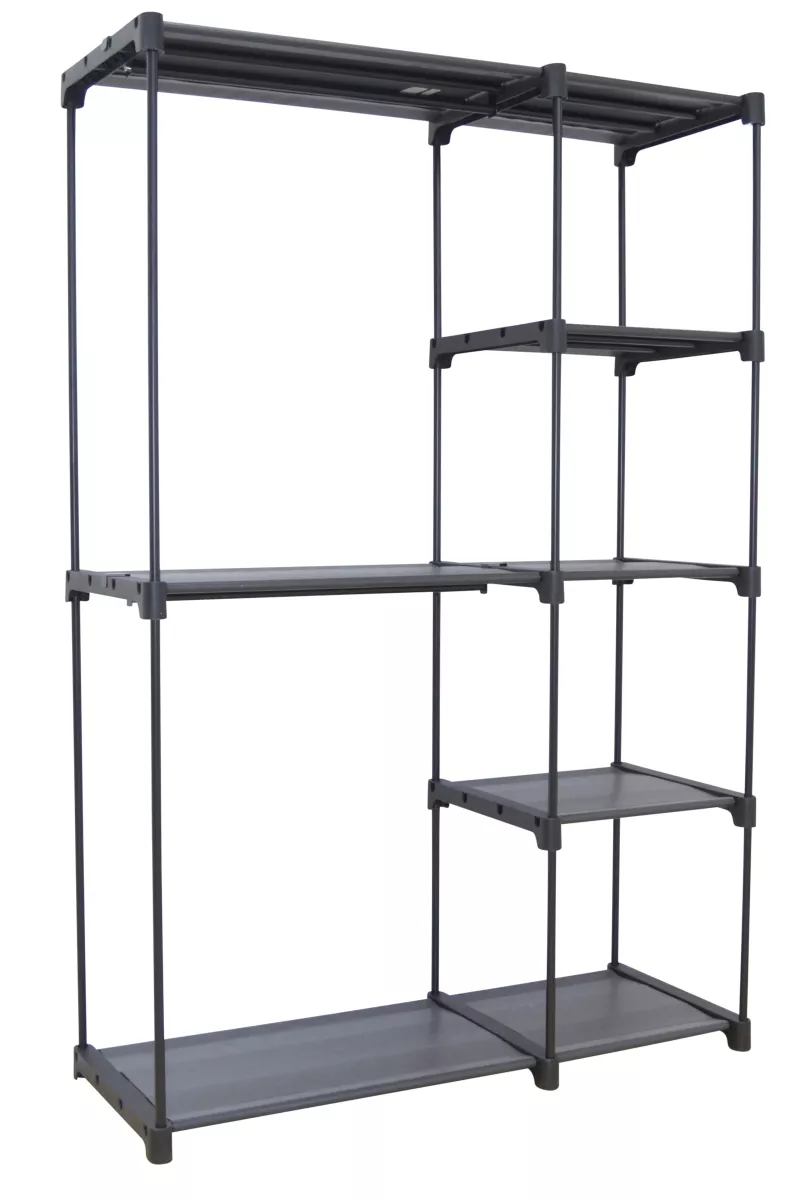 Dank des praktischen Stecksystems lassen sich die robusten Stahlrohre schnell und ohne Werkzeug miteinander verbinden. Vier schmale Ablageböden (ca. 38,5 cm breit) und zwei größere Ablagen (ca. 65 cm breit) bieten reichlich Platz für Kleidung, Schuhe und Accessoires. Zwei integrierte Kleiderstangen ermöglichen das ordentliche Aufhängen von Hemden, Blusen oder Jacken.
