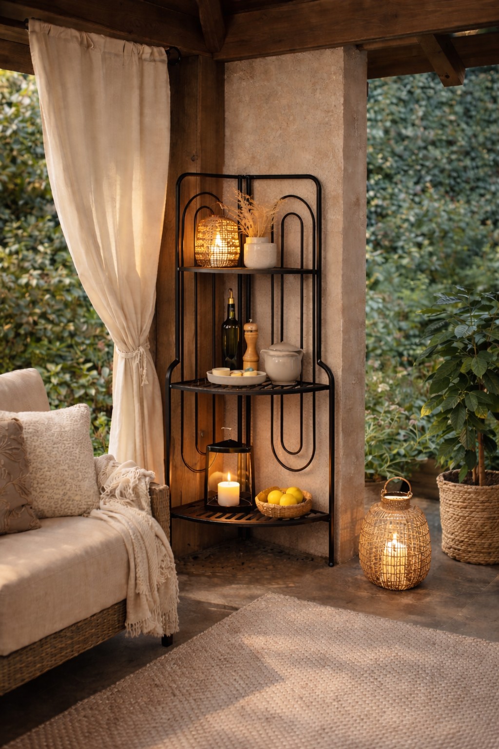 Durch die robuste Verarbeitung eignet sich das Eckregal außerdem auch für den geschützten Outdoorbereich, z. B. auf Balkon, Terrasse oder im Wintergarten.