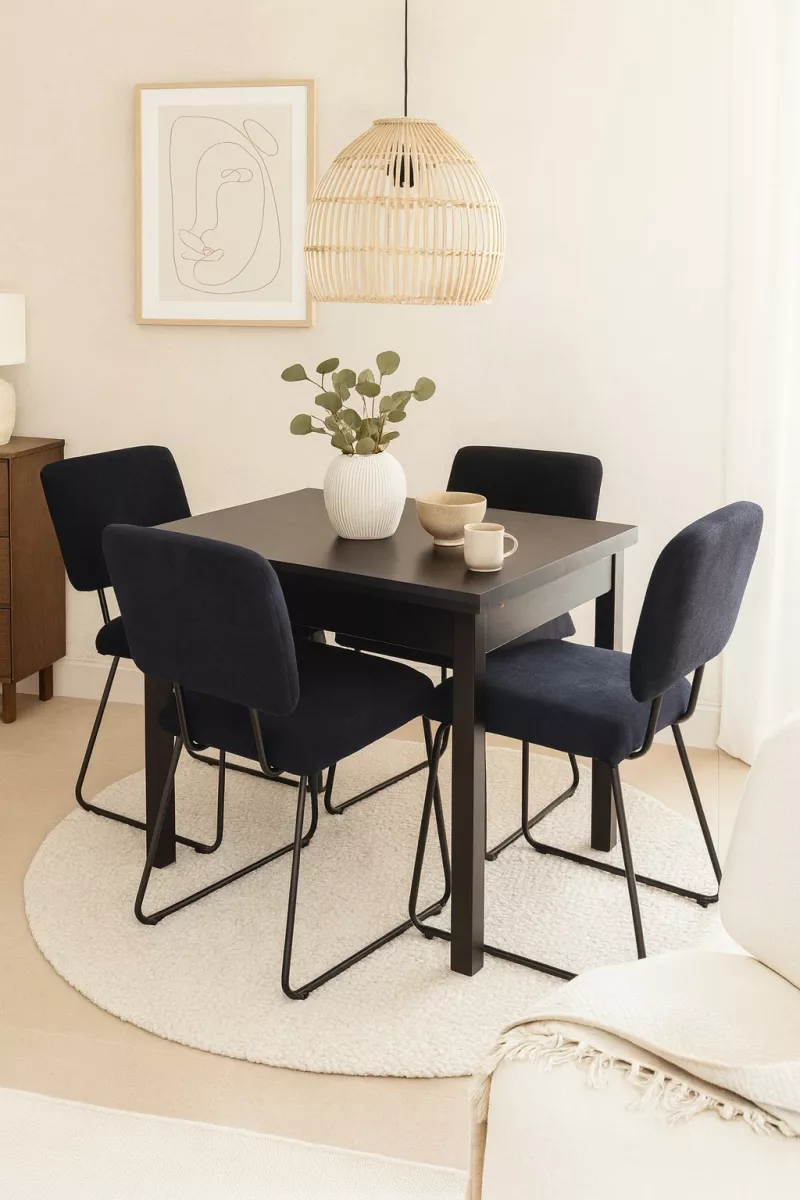 Das schwarz pulverbeschichtete Metallgestell sorgt für Stabilität und einen zeitlosen Look. Sitz und Rücken sind extra stark schaumstoffgepolstert und mit einem pflegeleichten Stoffbezug (100 % Polyester) in edlem Schwarz bezogen – perfekt für modern eingerichtete Essbereiche, Küchen oder Wohnräume.