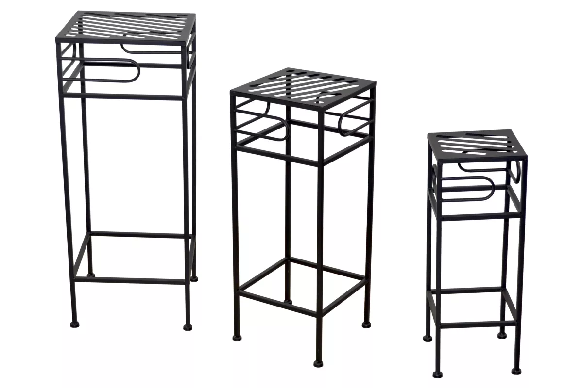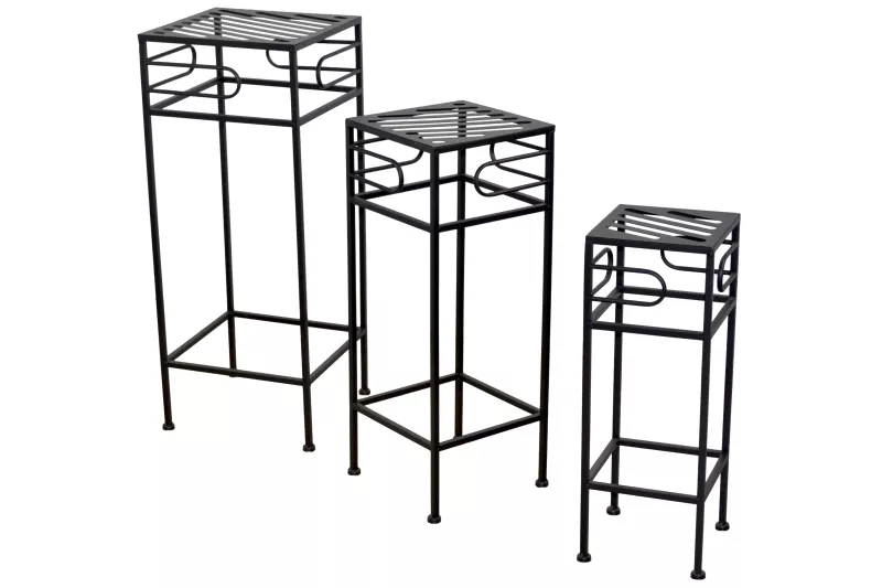 Die schwarz pulverbeschichtete Oberfläche wirkt edel und hochwertig, ist besonders pflegeleicht, langlebig und widerstandsfähig. Durch die drei unterschiedlichen Höhen entsteht ein harmonisches Gesamtbild, das sich ideal für Pflanzenarrangements, Blumentöpfe oder Dekorationsobjekte eignet.