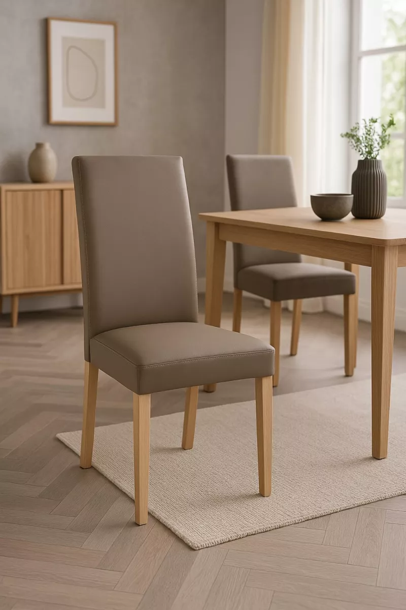Erleben Sie modernes Wohnen mit diesem hochwertigen Polsterstuhl-Set (2 Stück) in elegantem Taupe-Kunstleder. Die stilvollen Esszimmerstühle überzeugen durch ihren zeitlosen Look, hohen Sitzkomfort und ihre langlebige Verarbeitung – ideal für Esszimmer, Küche oder Wohnbereich.