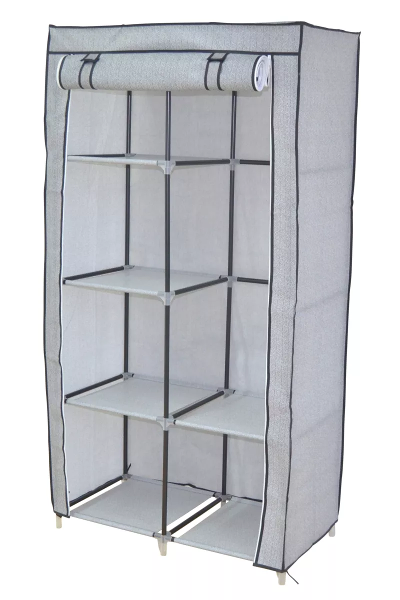 Dieser praktische Stoff-Kleiderschrank bietet mit seinen 6 Ablagefächern und einer Kleiderstange reichlich Platz für Kleidung, Schuhe und Accessoires. Dank des stabilen Metallrohr-Gestells lässt sich der Schrank einfach und schnell aufbauen, ganz ohne Werkzeug. Die hochwertige Stoffhülle in schwarz-grau meliertem Design schützt Ihre Kleidung zuverlässig vor Staub und Schmutz – ideal für Schlafzimmer, Ankleide, Gästezimmer oder Keller.