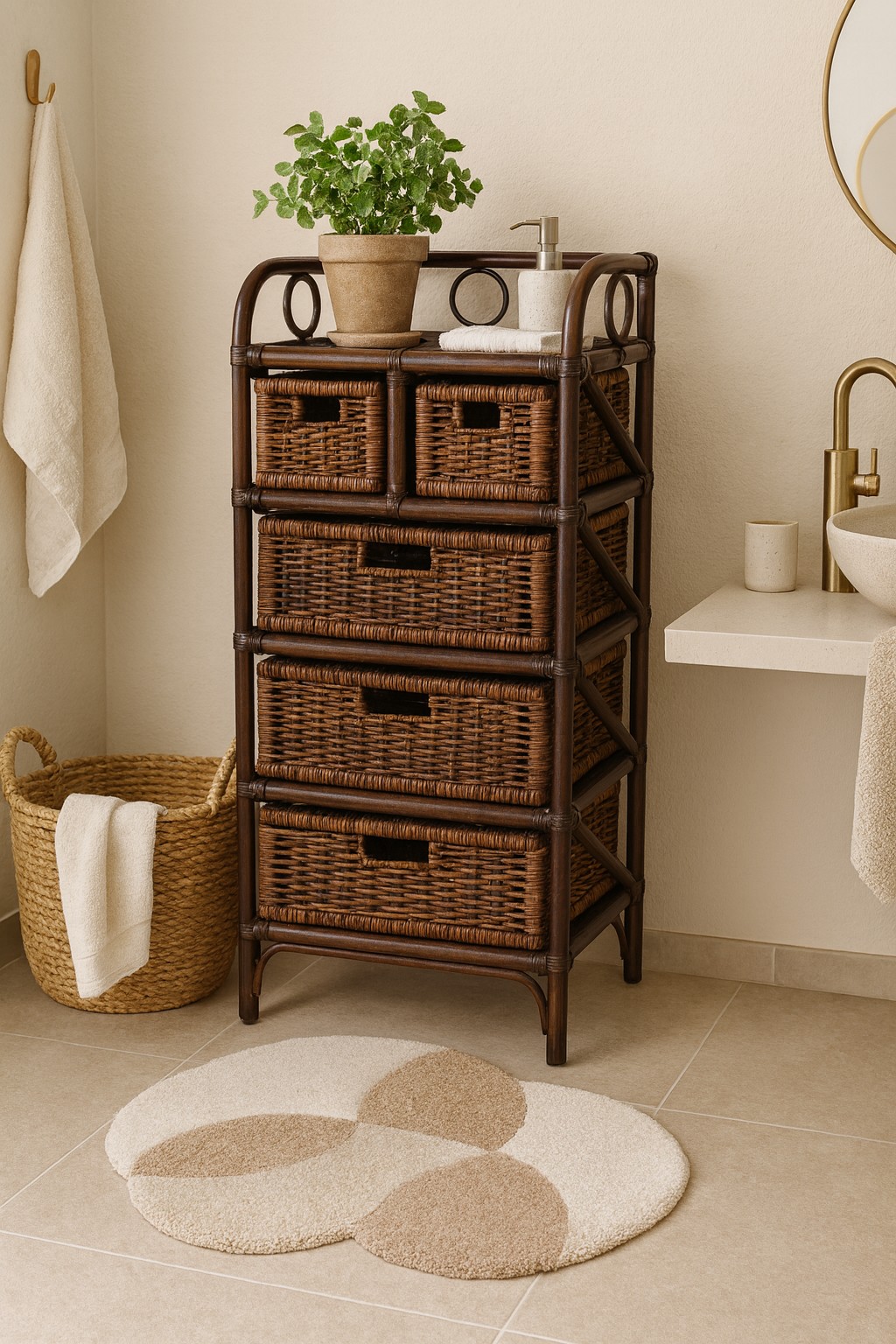 Dieses elegante Rattanmöbel eignet sich perfekt als Badregal, Nachttisch, Kommode im Flur oder Beistellmöbel im Wohnzimmer. Es bringt natürliche Wärme in jeden Raum und sorgt für ein harmonisches Ambiente.