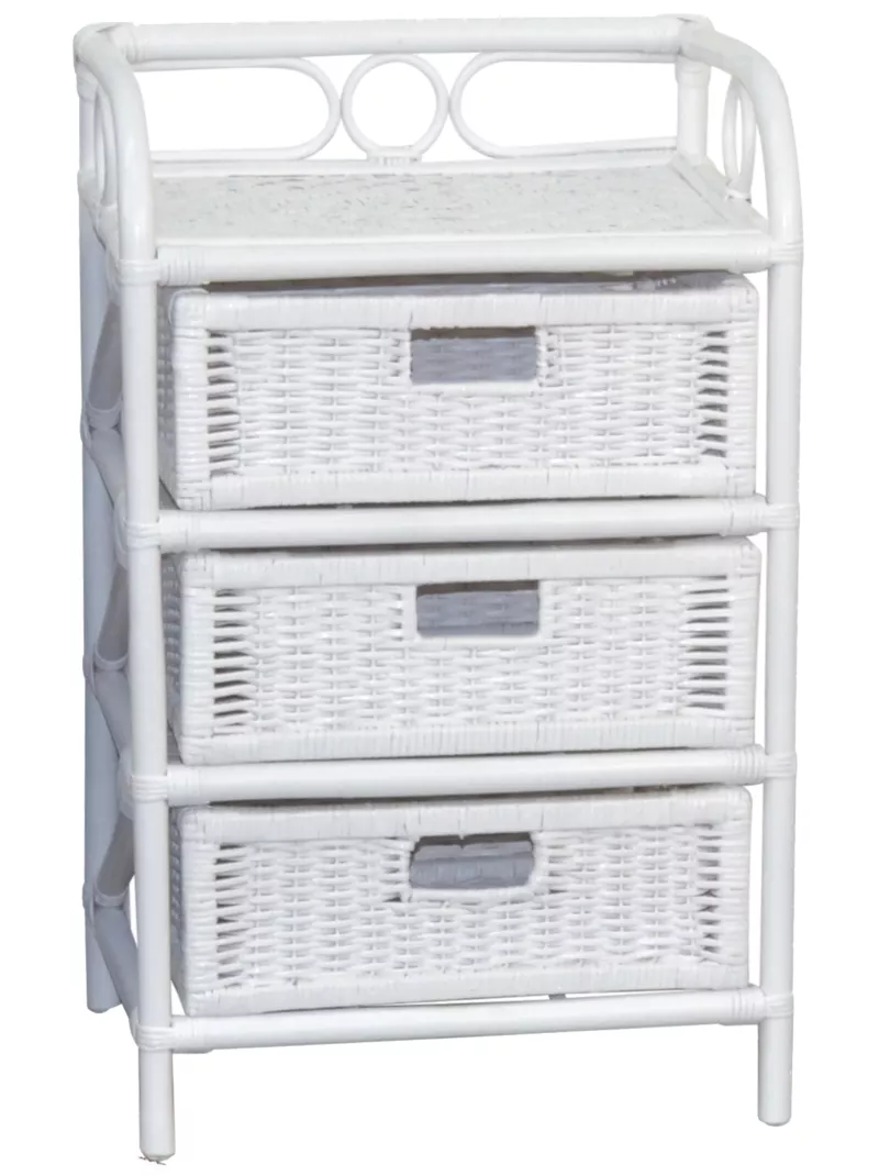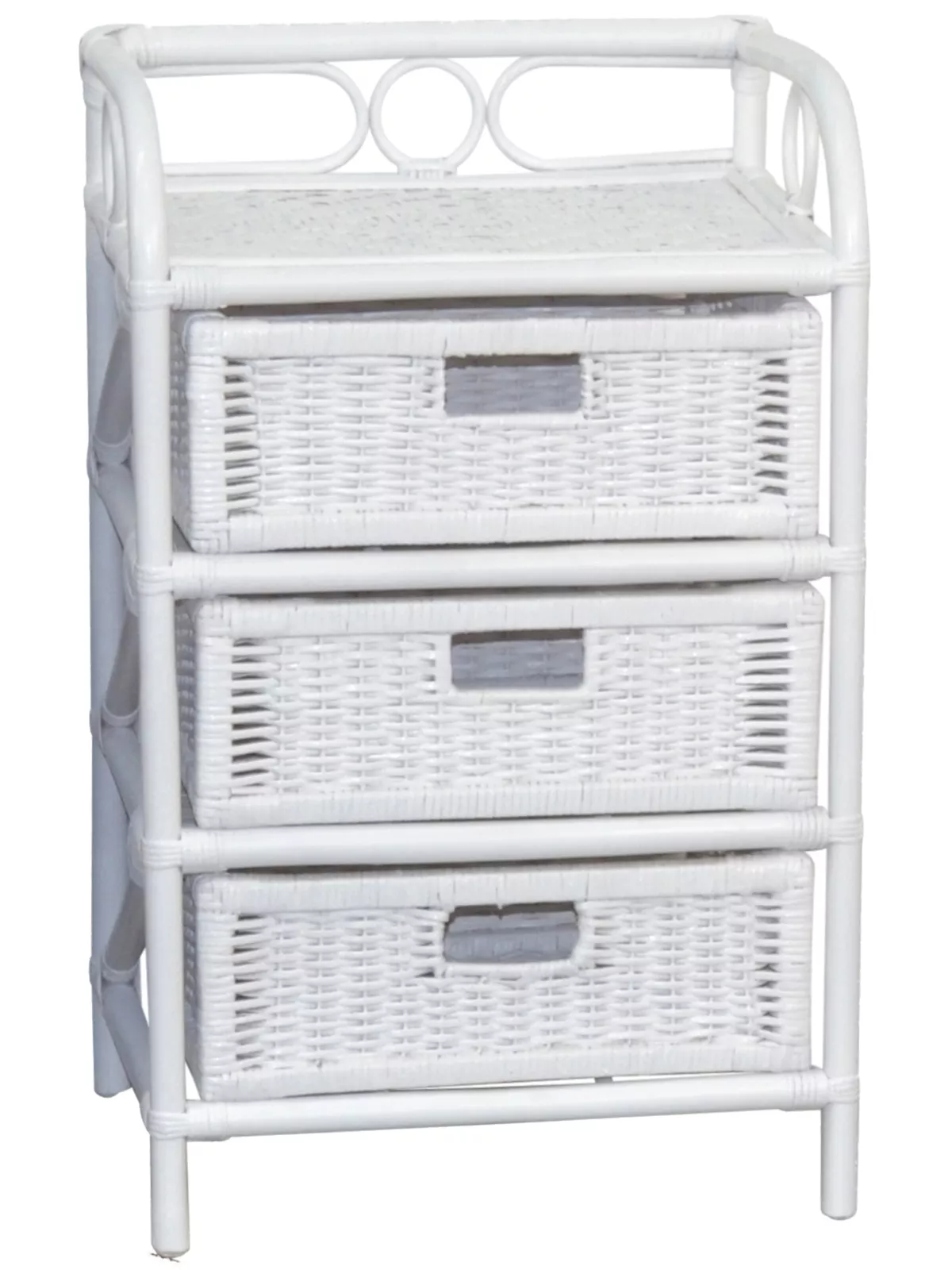 Jedes Regal besteht aus einem stabilen Rahmen aus Rattanrohr mit fein handgeflochtenem Rattangeflecht. Die drei Schubkästen sind lose eingeschoben, besitzen einen robusten Holzrahmen und sind ebenfalls mit Rattangeflecht handgeflochten. Praktisch: Jeder Schubkasten hat vorne einen eingeflochtenen Griff, der das natürliche Design unterstreicht.