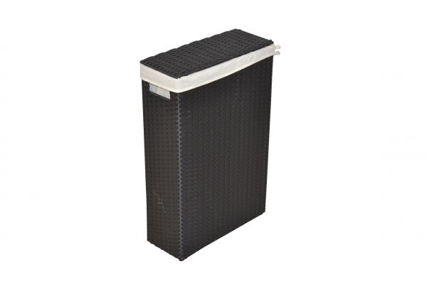 Dieser praktische, handgeflochtene Raumspar-Wäschekorb ist mit pflegeleichten Polyrattan in den Farben braun mix, schwarz und grau lieferbar.