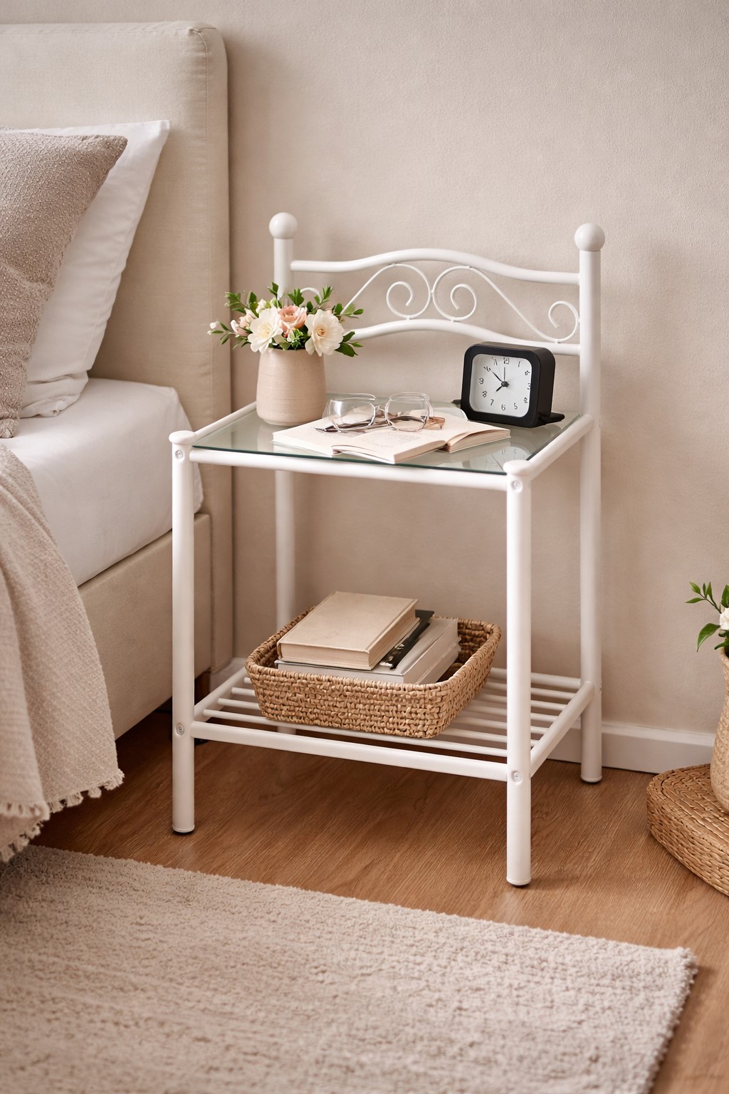 Die obere Ablage aus Sicherheits-Klarglas bietet eine stabile und pflegeleichte Fläche für Nachttischlampe, Bücher, Wecker oder Dekoration. Eine praktische Sprossenablage im unteren Bereich schafft zusätzlichen Stauraum für Magazine, Decken oder weitere Accessoires und sorgt gleichzeitig für eine luftige, leichte Optik.