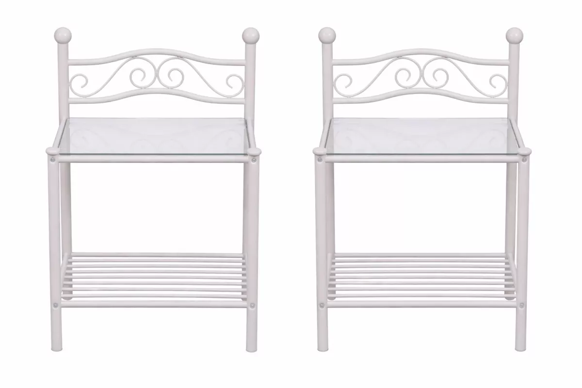 Mit ihrem romantischen Design und den dekorativen Metallverzierungen werden diese Nachttische aus Metall im 2er Set zum stilvollen Blickfang neben Ihrem Bett – ideal für Schlafzimmer im Landhausstil, Vintage-Stil oder Shabby Chic.