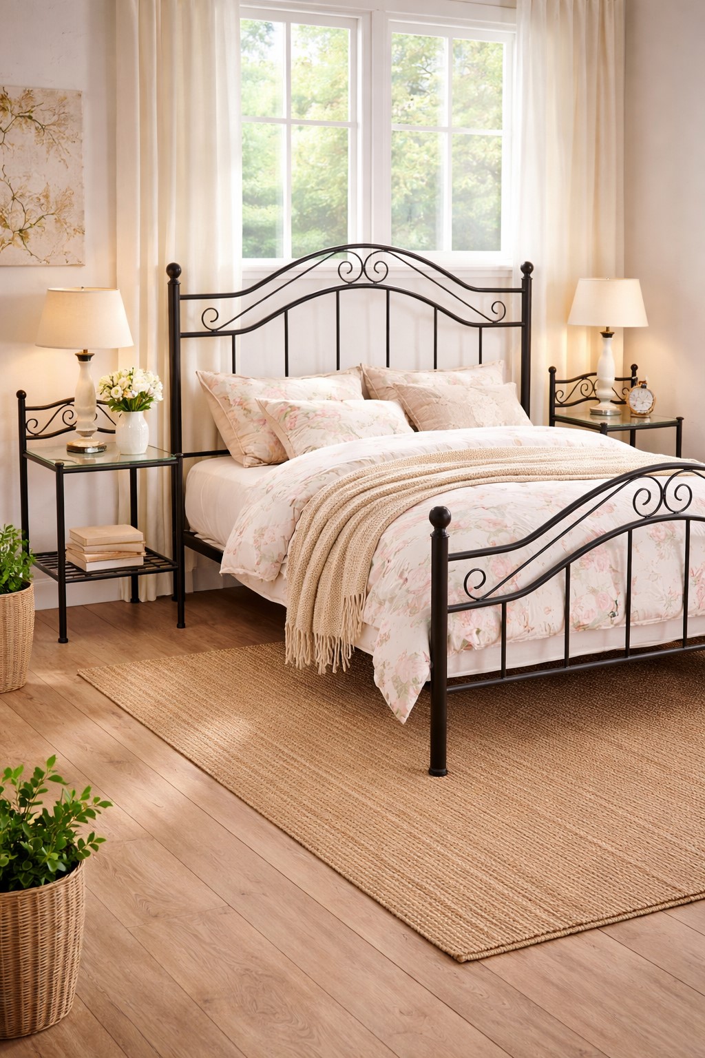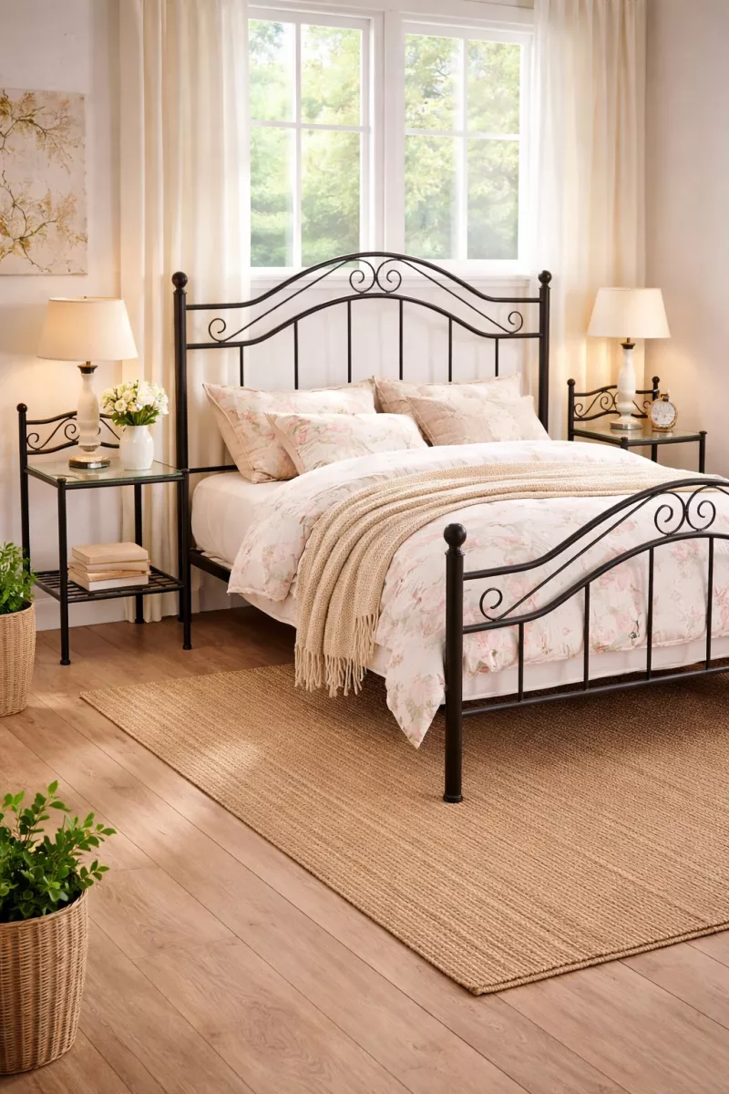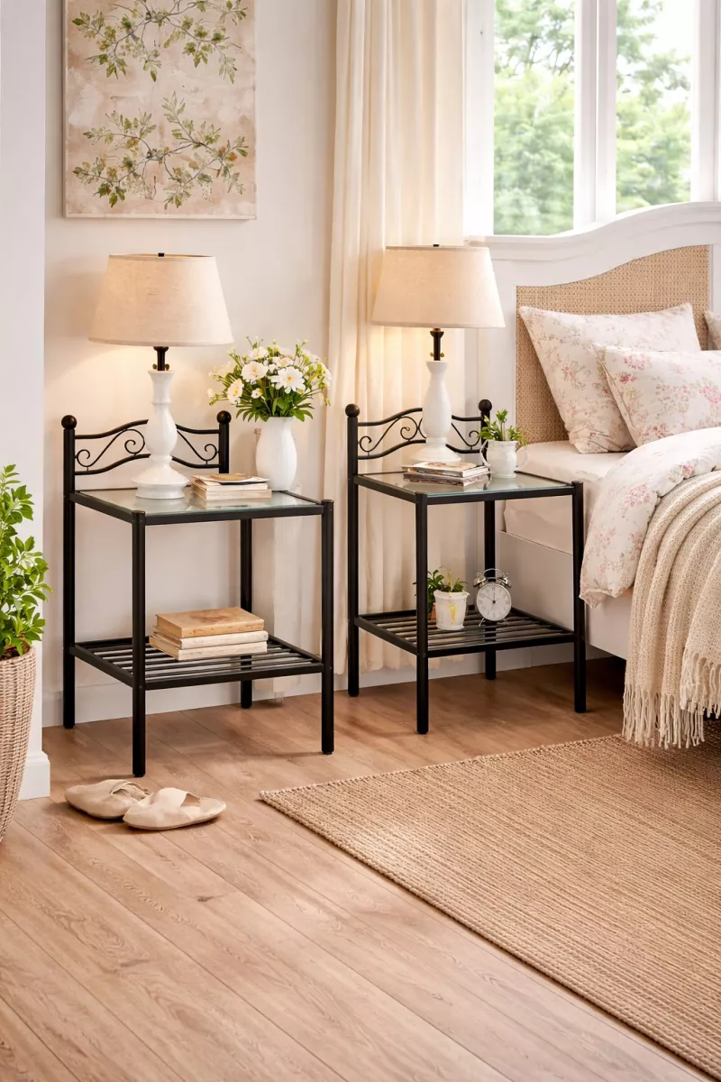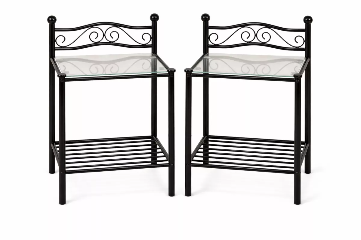 Das 2er Set romantischer Nachtkonsolen aus Metall verbindet elegantes Design mit praktischer Funktion. Die filigranen Verzierungen und das schwarz pulverbeschichtete Metallgestell verleihen den Nachttischen einen charmanten Vintage-Look, der perfekt zu klassischen, Landhaus- oder romantischen Einrichtungsstilen passt.