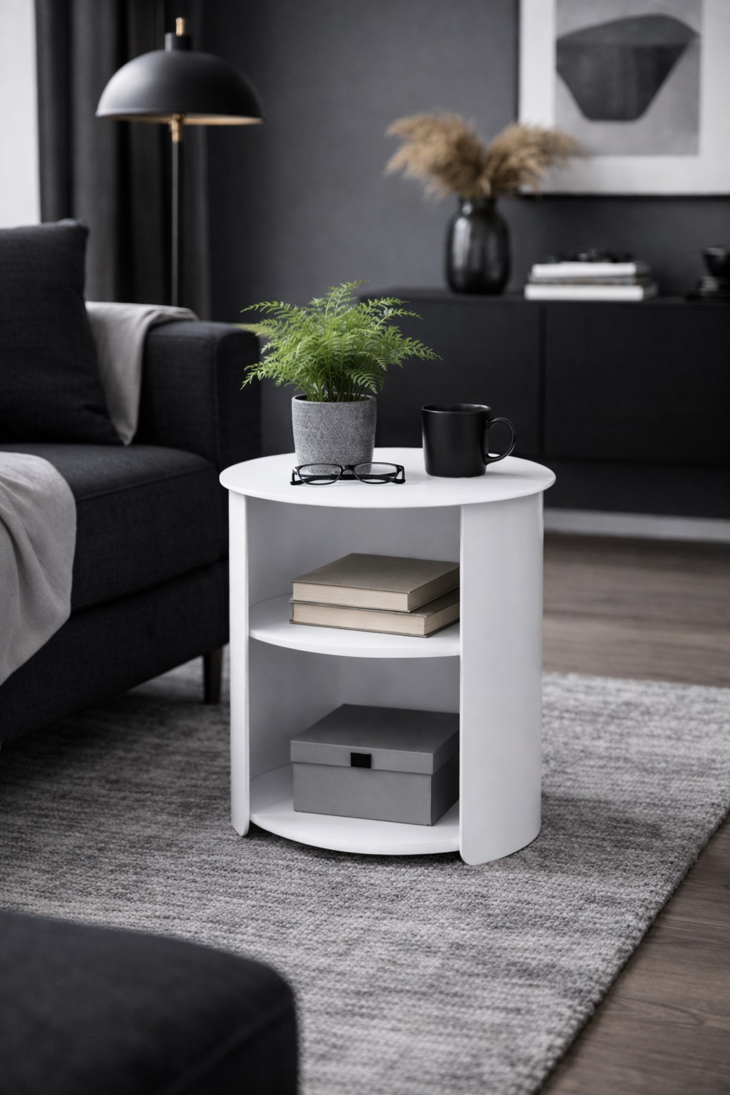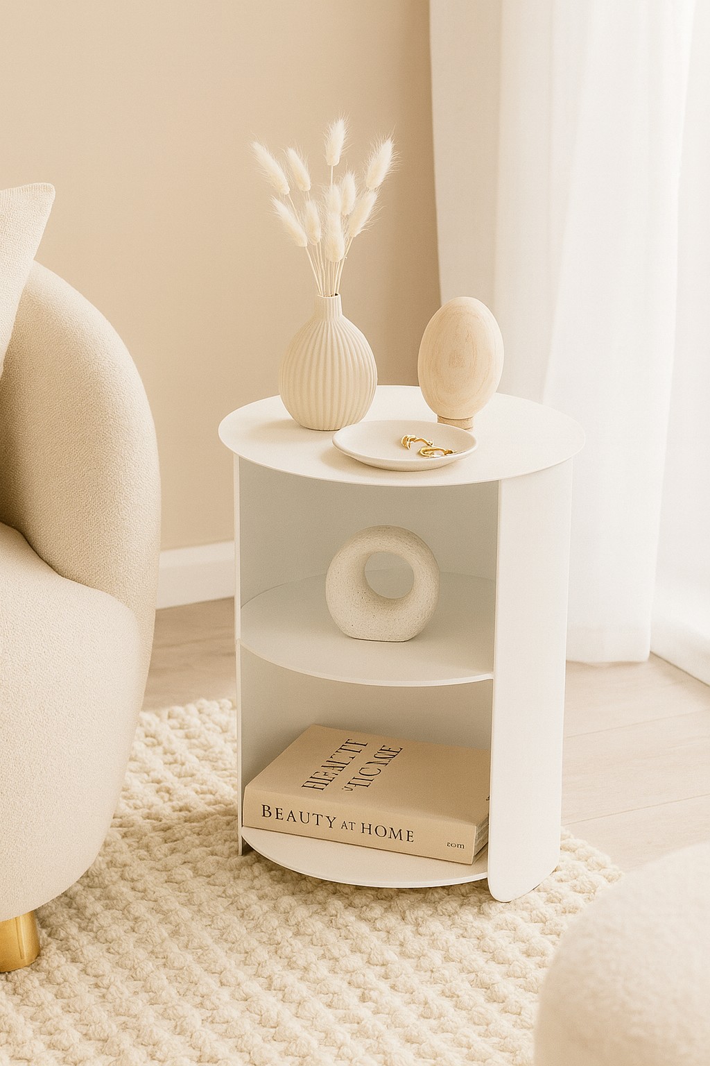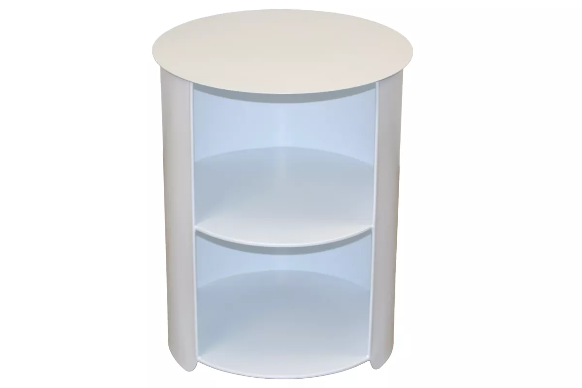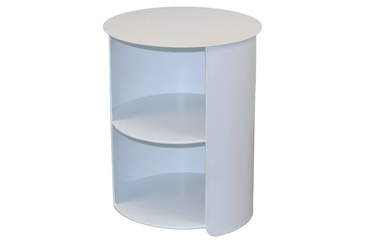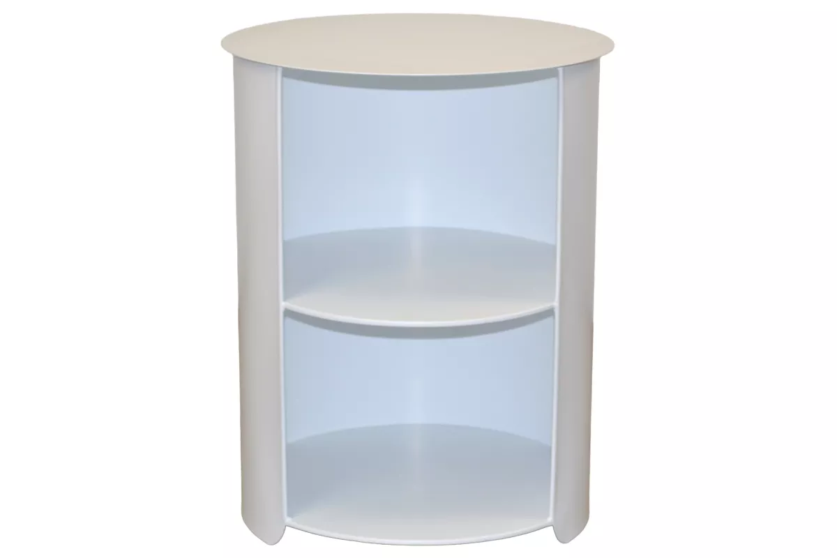 Der moderne runde Beistelltisch aus Metall überzeugt durch sein minimalistisches Design und seine vielseitige Funktionalität. Die weiße, pulverbeschichtete Oberfläche sorgt für eine elegante, zeitlose Optik und macht den Tisch besonders pflegeleicht sowie langlebig. Durch die offene Front wirkt der Beistelltisch leicht und modern und ermöglicht gleichzeitig einen schnellen Zugriff auf Bücher, Dekoration oder Alltagsgegenstände.