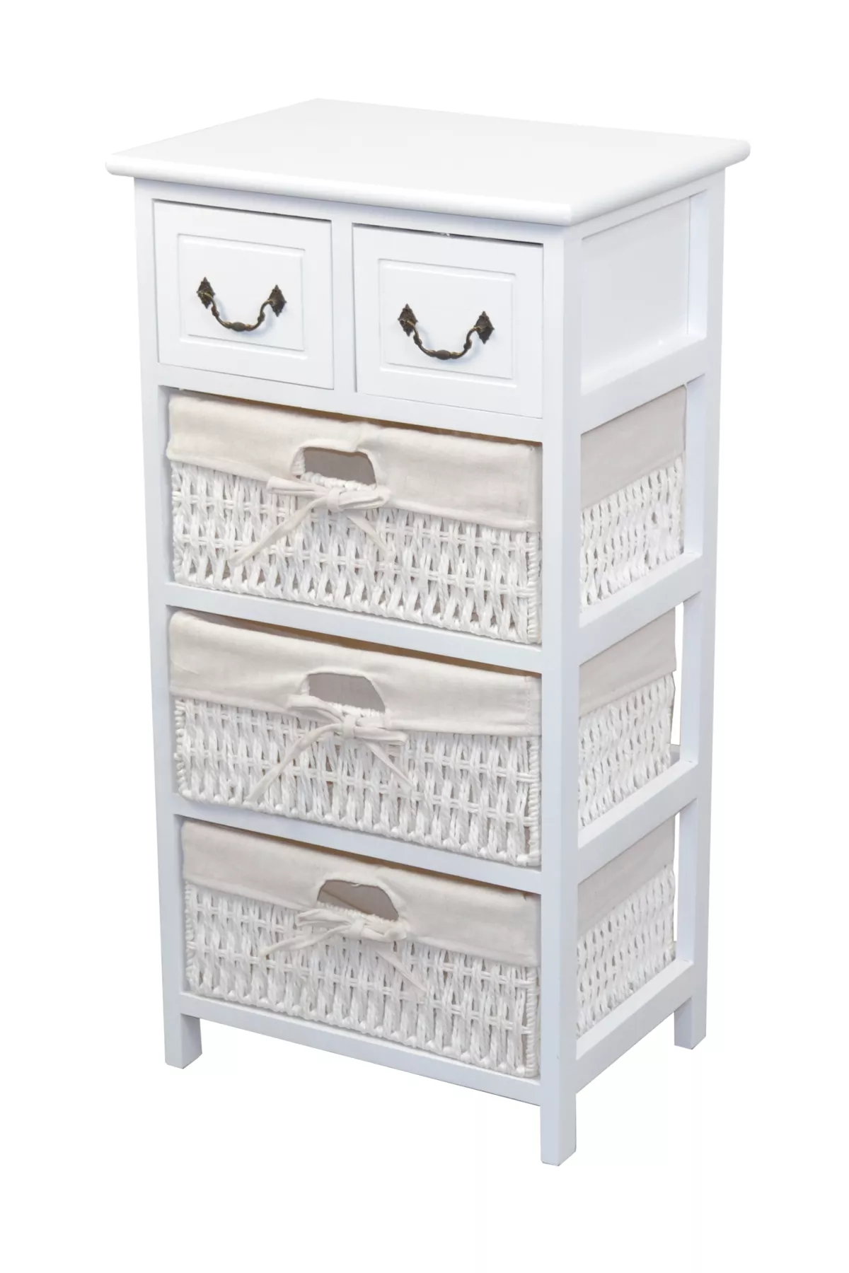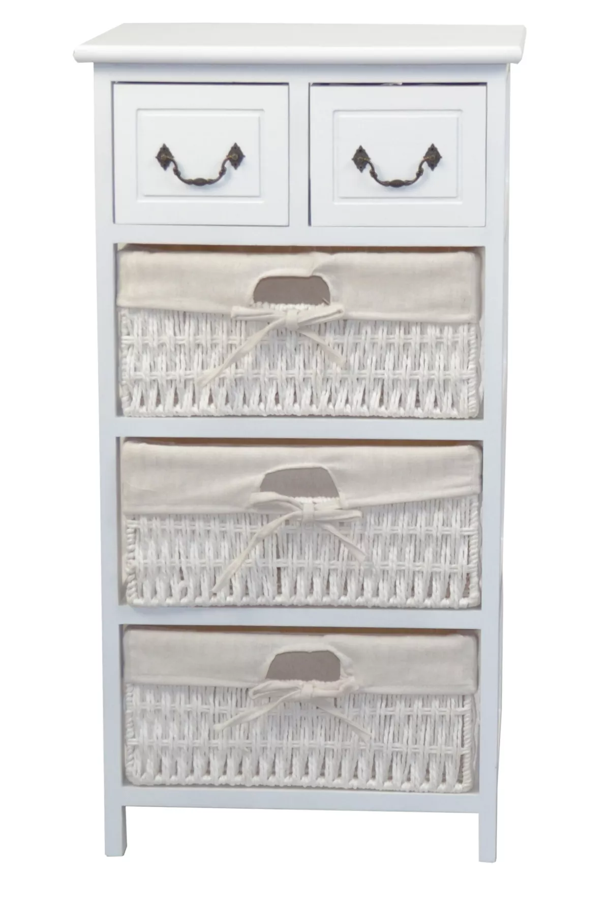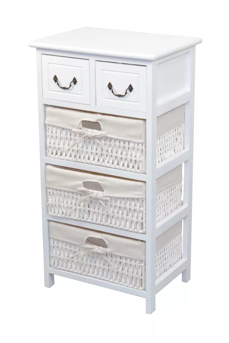 Im oberen Bereich befinden sich zwei Holzschubkästen mit dekorativen Metallgriffen, ideal für kleine Utensilien. Unten sorgen drei handgeflochtene Körbe mit stabilem Eisenrahmen für zusätzlichen Stauraum. Jeder Korb ist mit einem herausnehmbaren Stoffeinsatz (100% Polyester, beigefarben) ausgestattet – pflegeleicht und hygienisch.