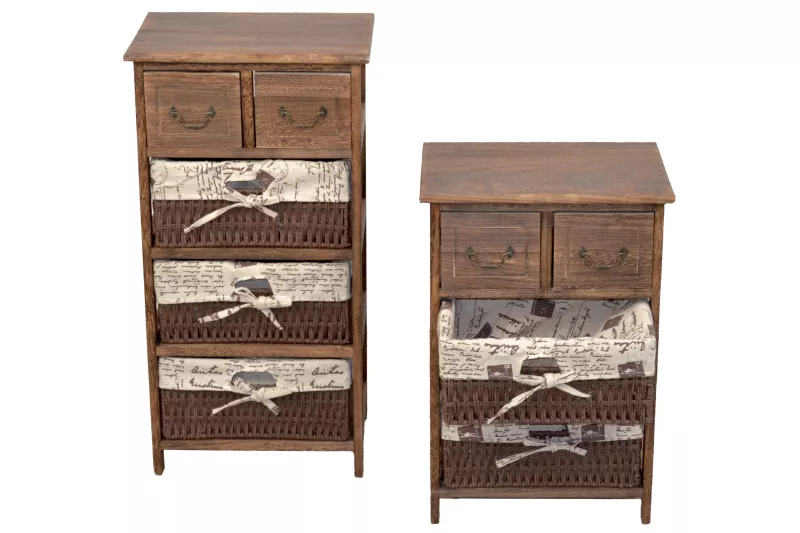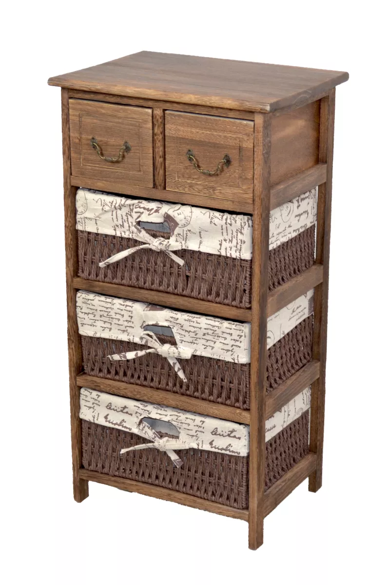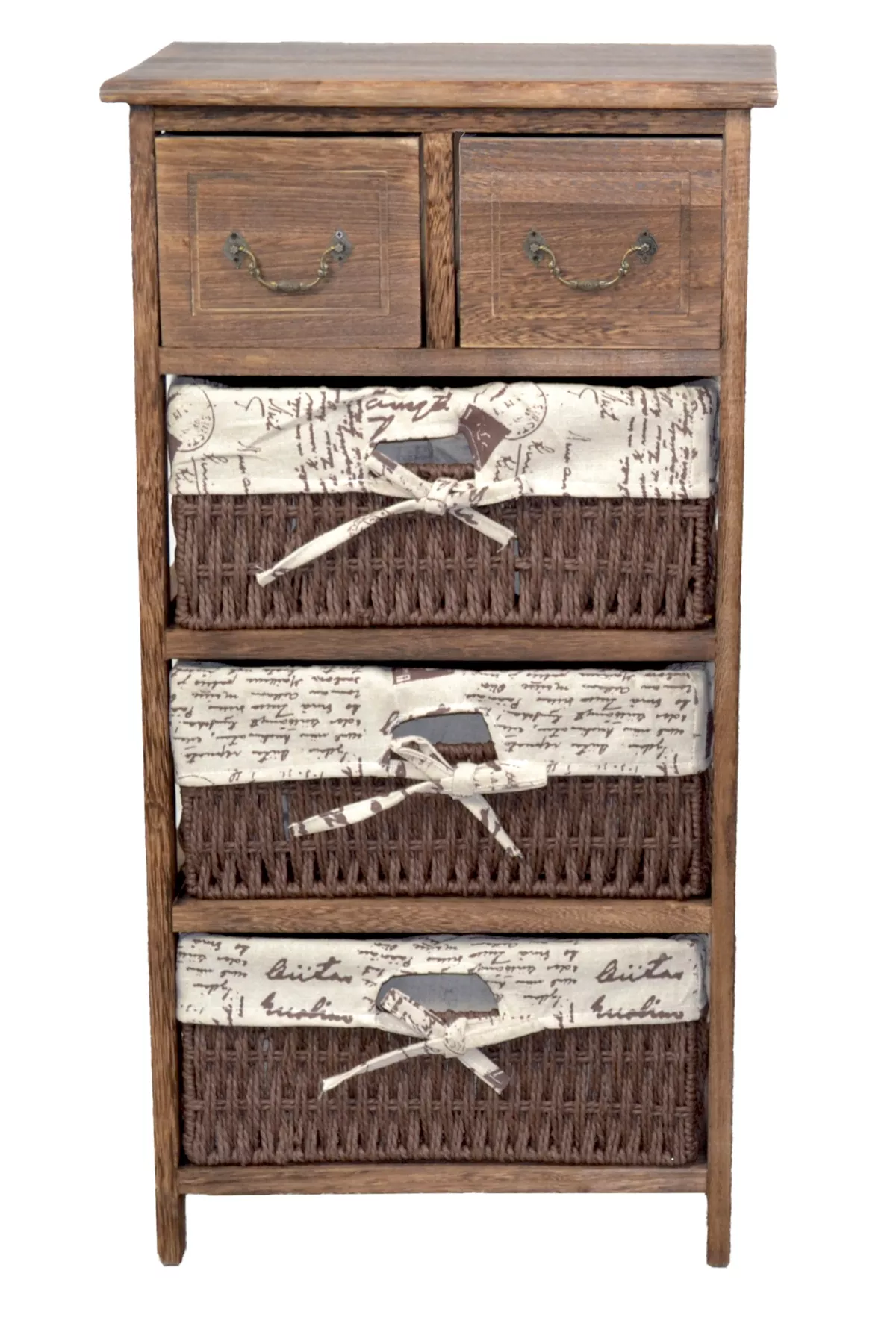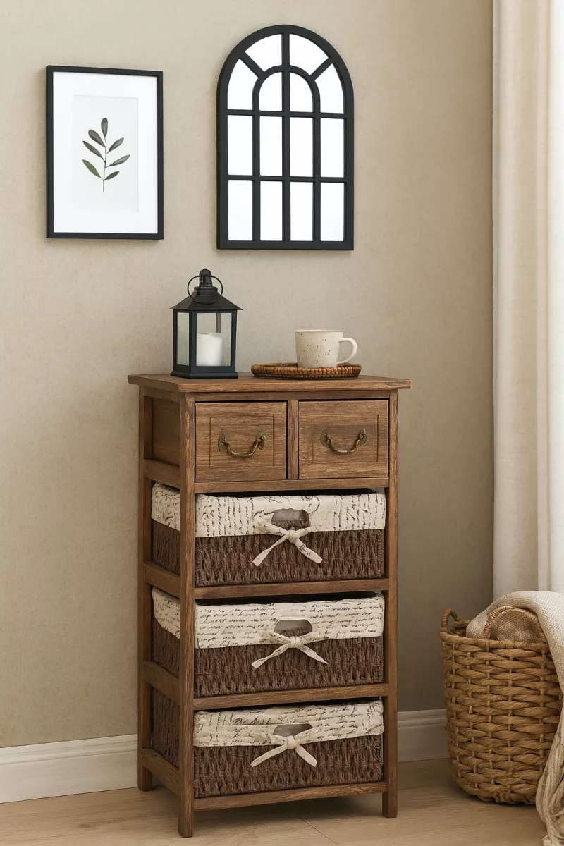 Praktische Aufbewahrung – oben 2 Holzschubladen, unten 3 handgeflochtene Körbe