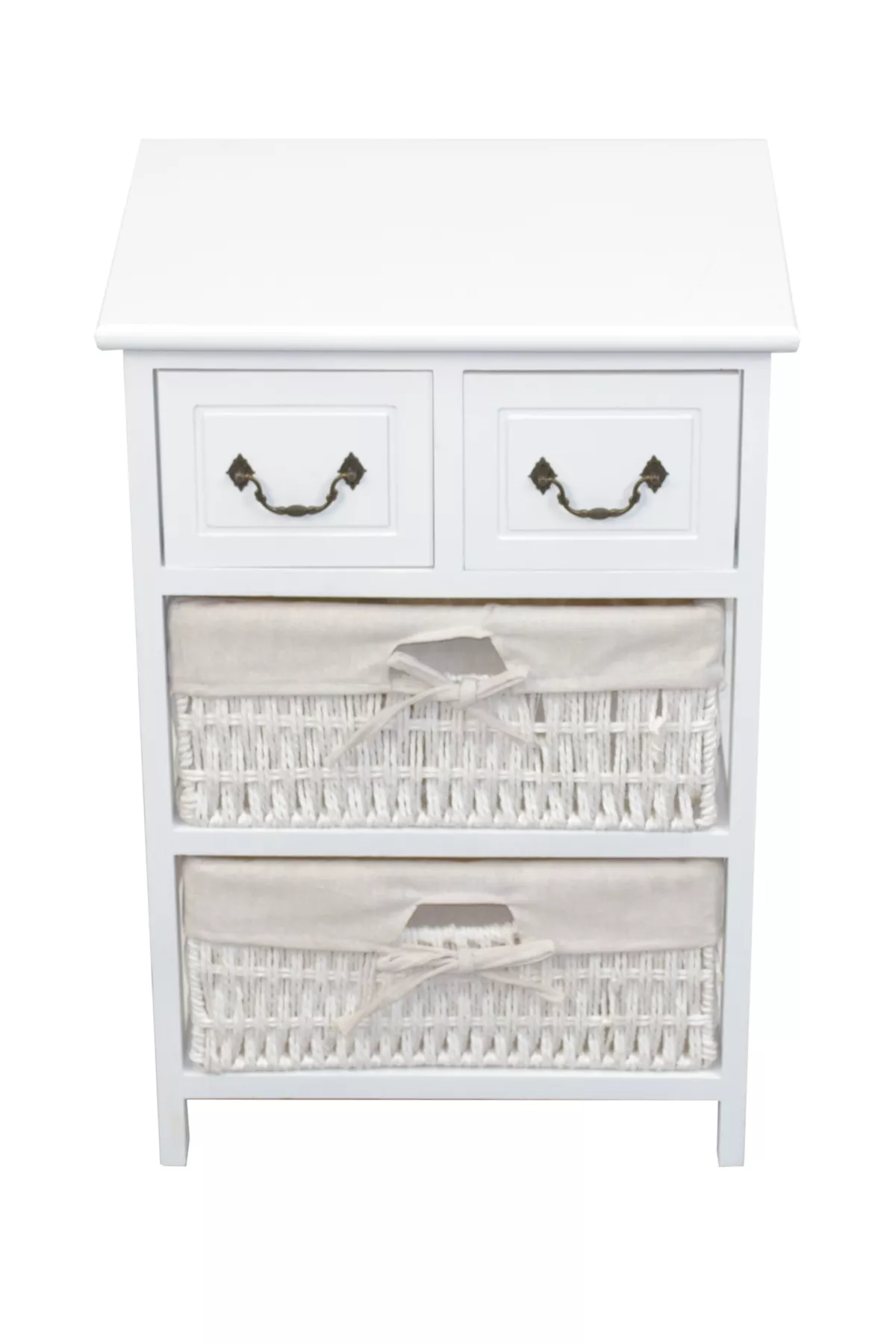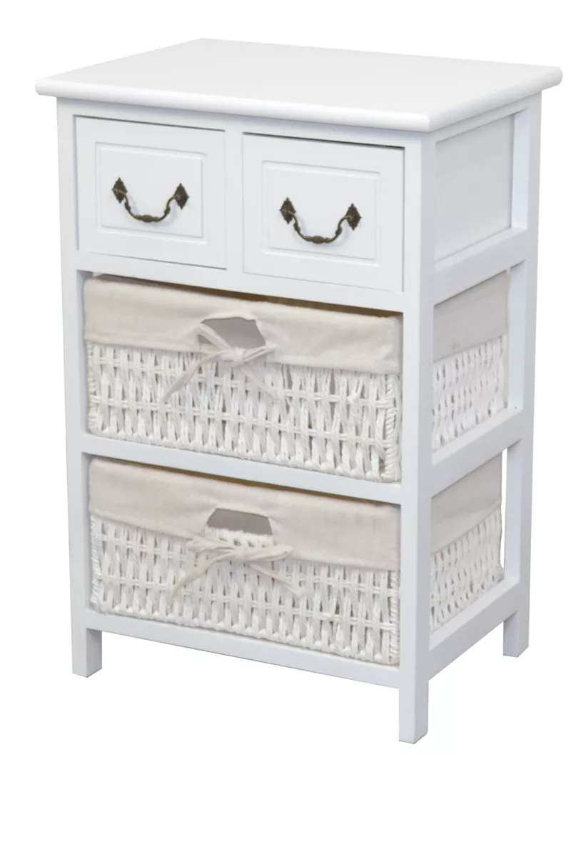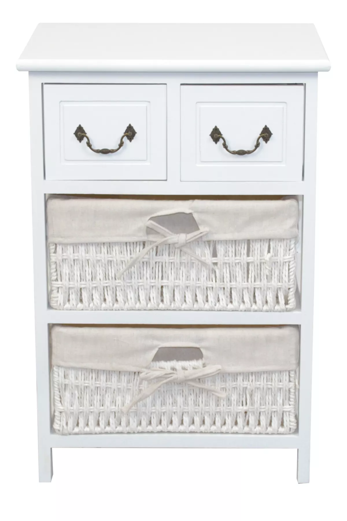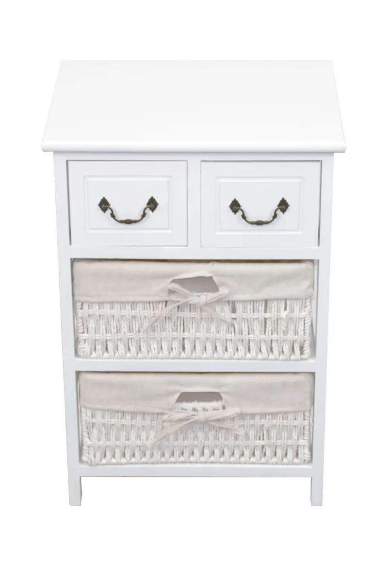 Stauraum: 2 praktische Holzschubkästen oben und 2 handgeflochtene Körbe unten