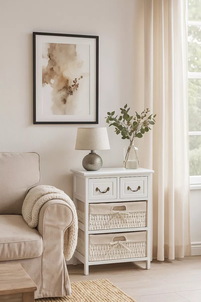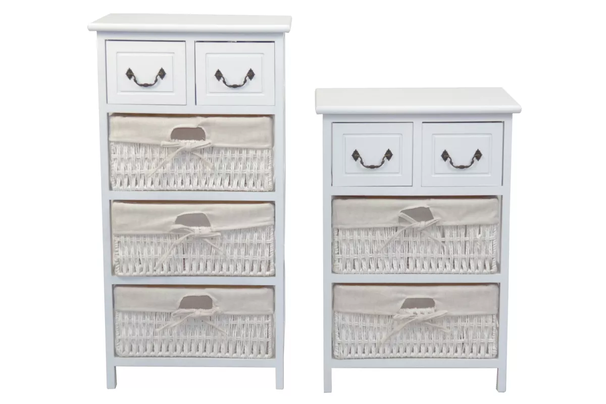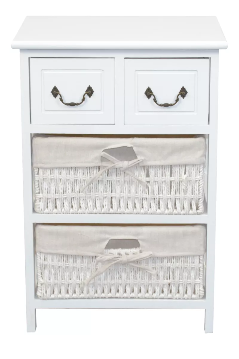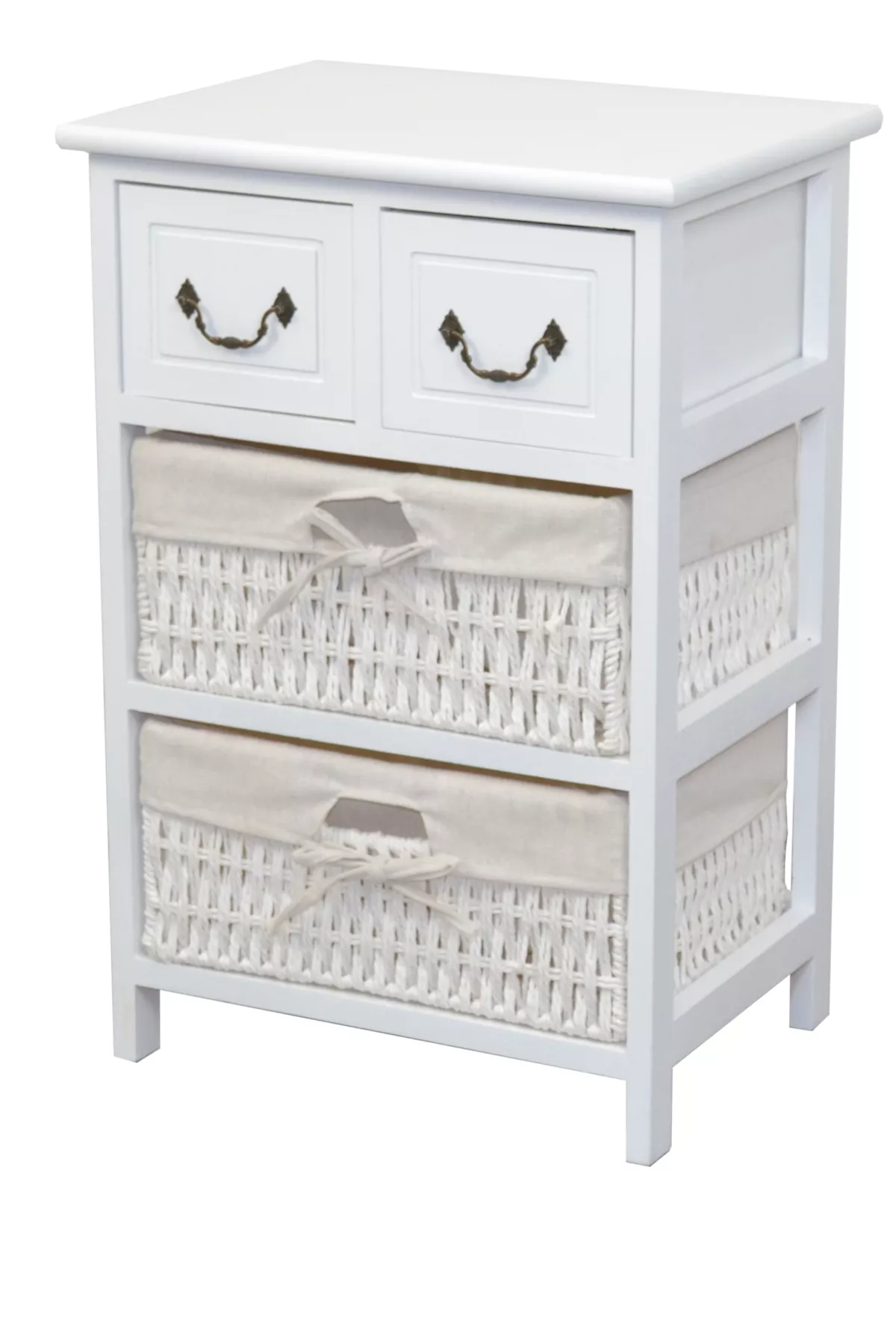 Stauraum: 2 praktische Holzschubkästen oben und 2 handgeflochtene Körbe unten