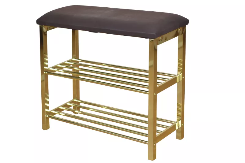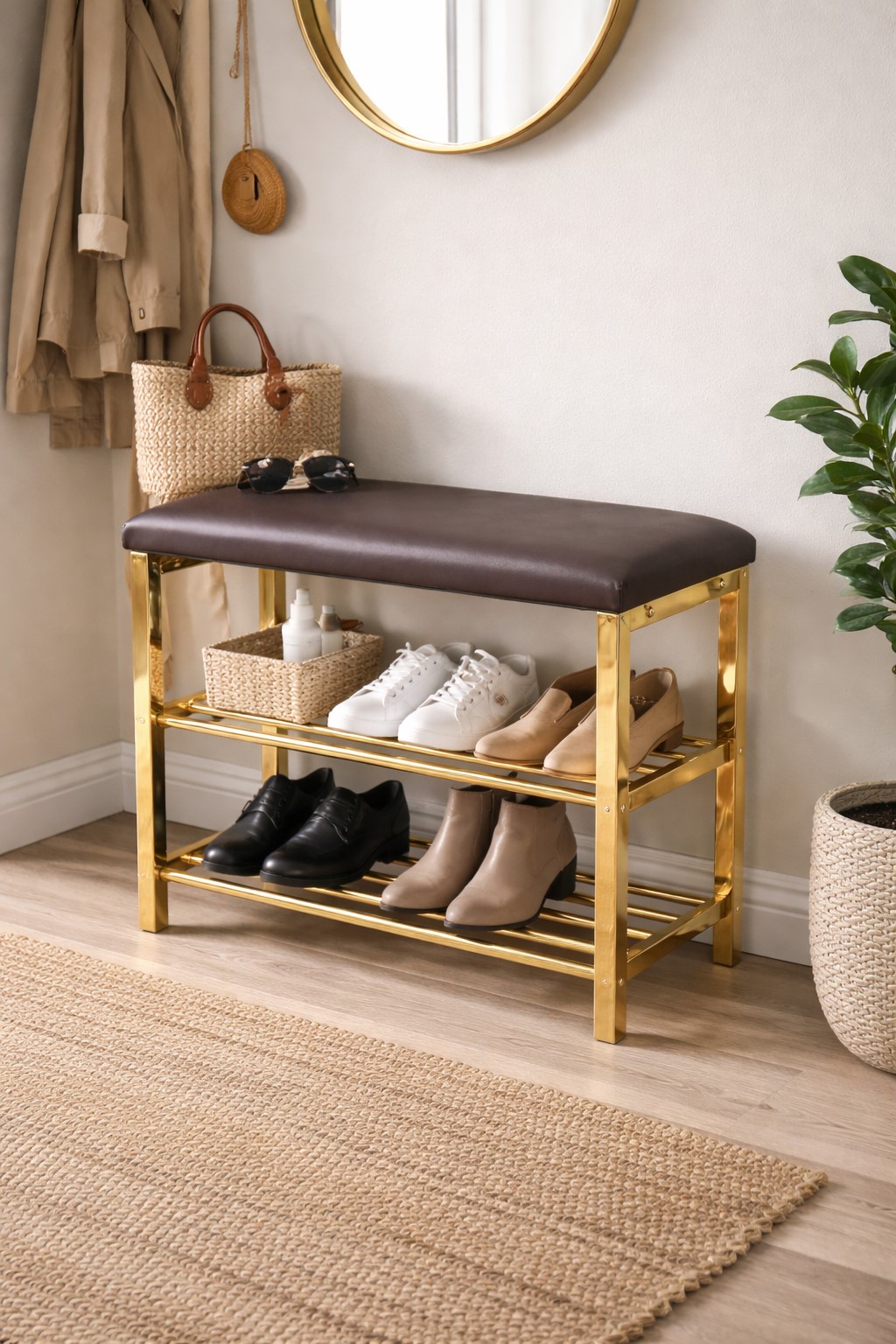 Diese moderne Sitz- und Schuhbank vereint stilvolles Design, hohen Sitzkomfort und praktische Funktionalität in einem Möbelstück. Mit ihrer edlen messingfarbenen Metallkonstruktion und dem moccafarbenen Sitzkissen setzt sie elegante Akzente im Flur, Eingangsbereich, Schlafzimmer oder Ankleidezimmer.