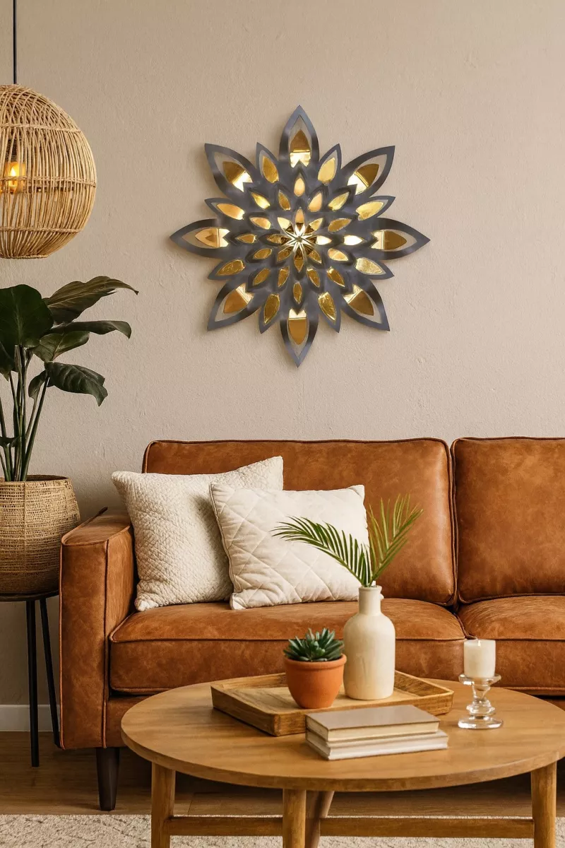 Wanddekoration aus Metall in Form einer großen Seerosenblüte, schwarz/goldfarben lackiert.