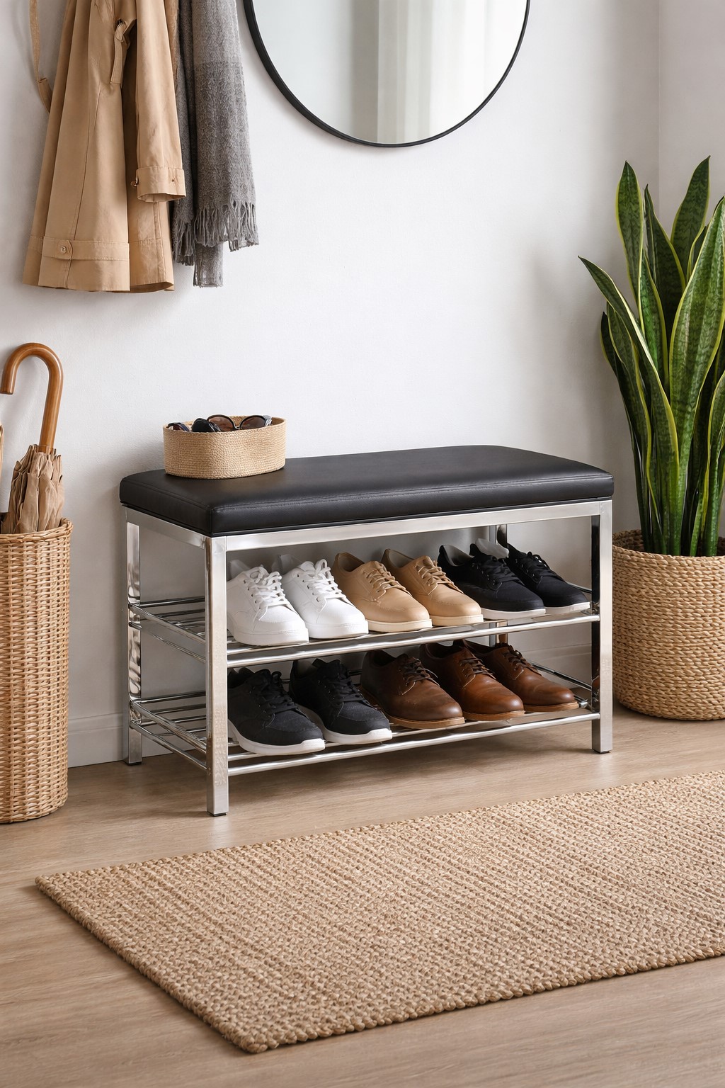 Diese trendige Metall-Sitzbank mit Schuhablage ist die perfekte Kombination aus Design, Komfort und Stauraum – ein praktisches Möbelstück, das Ordnung schafft und gleichzeitig stilvolle Akzente setzt.
