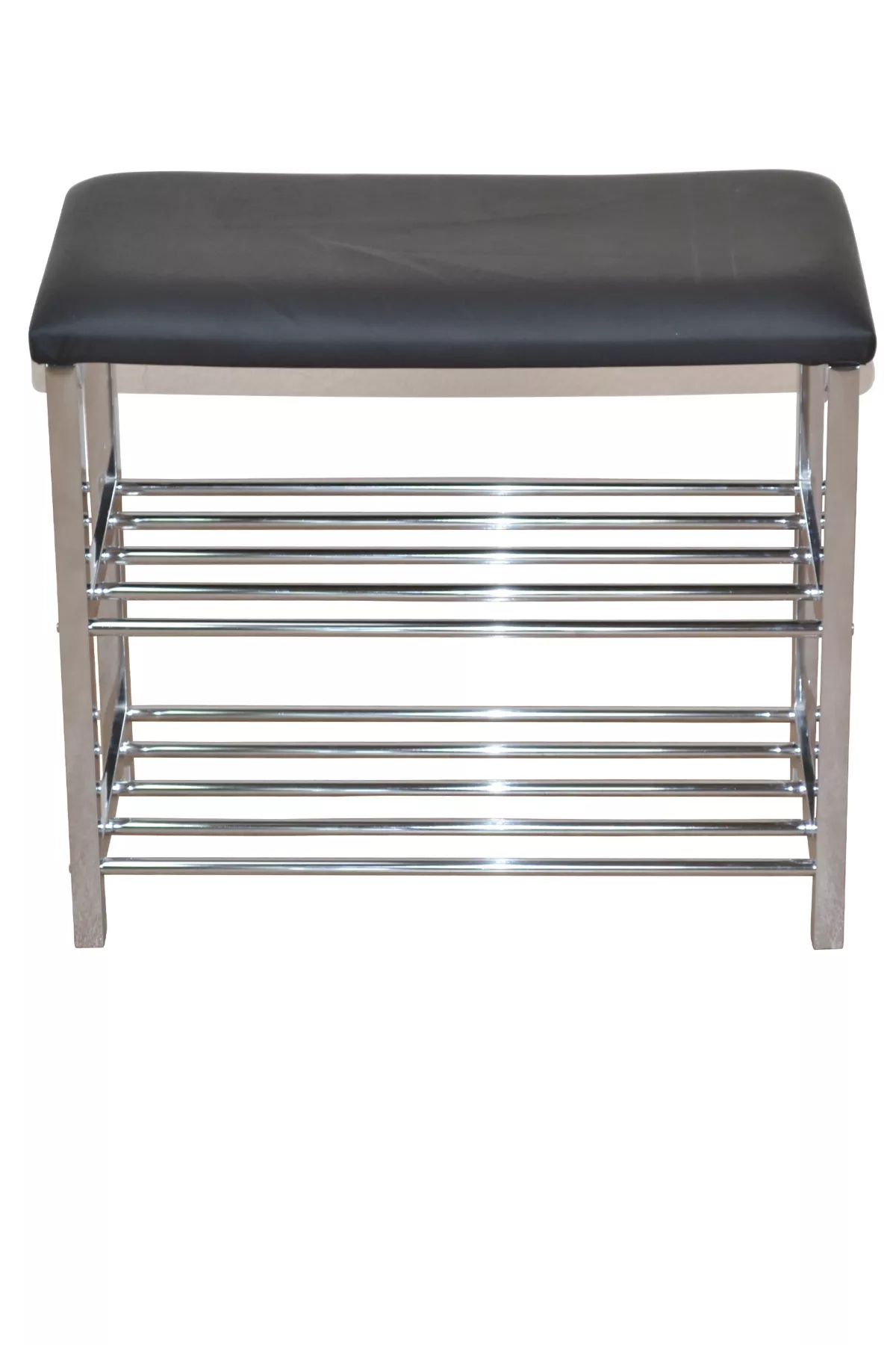 Das stabile Gestell aus verchromtem Vierkantstahl sorgt für eine hohe Standfestigkeit und unterstreicht den modernen, zeitlosen Look der Sitzbank. Besonders praktisch sind die zwei trendig verchromten Gitterablagen aus Stahlrohr, auf denen sich bis zu ca. 6 Paar Schuhe ordentlich und griffbereit verstauen lassen.