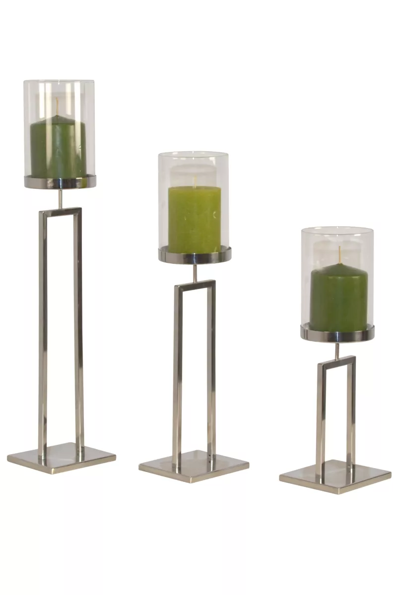 Bringen Sie stilvolle Eleganz in Ihr Zuhause mit diesem 3-teiligen Kerzenständer-Set im modernen Design. Die Kombination aus hochwertig verchromtem Metall und klaren Glaszylindern macht dieses Set zu einem echten Blickfang auf jedem Sideboard, Tisch oder Fensterbrett.