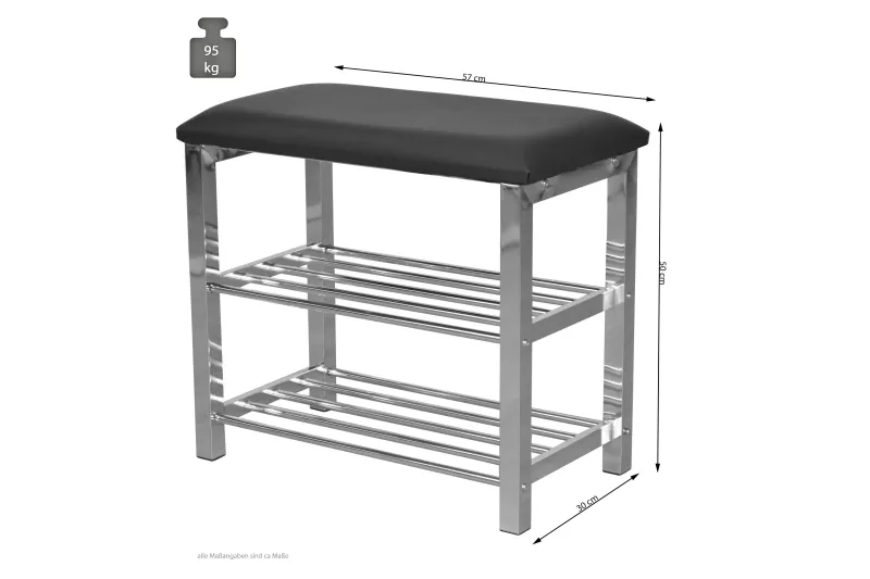 Das stabile Gestell aus Vierkantstahl sorgt für einen sicheren Stand, während die zwei verchromten Gitterablagen aus Stahlrohr zusätzlichen Stauraum bieten. Hier lassen sich Schuhe, Taschen oder andere Alltagsgegenstände ordentlich und griffbereit unterbringen – perfekt für einen aufgeräumten Eingangsbereich.