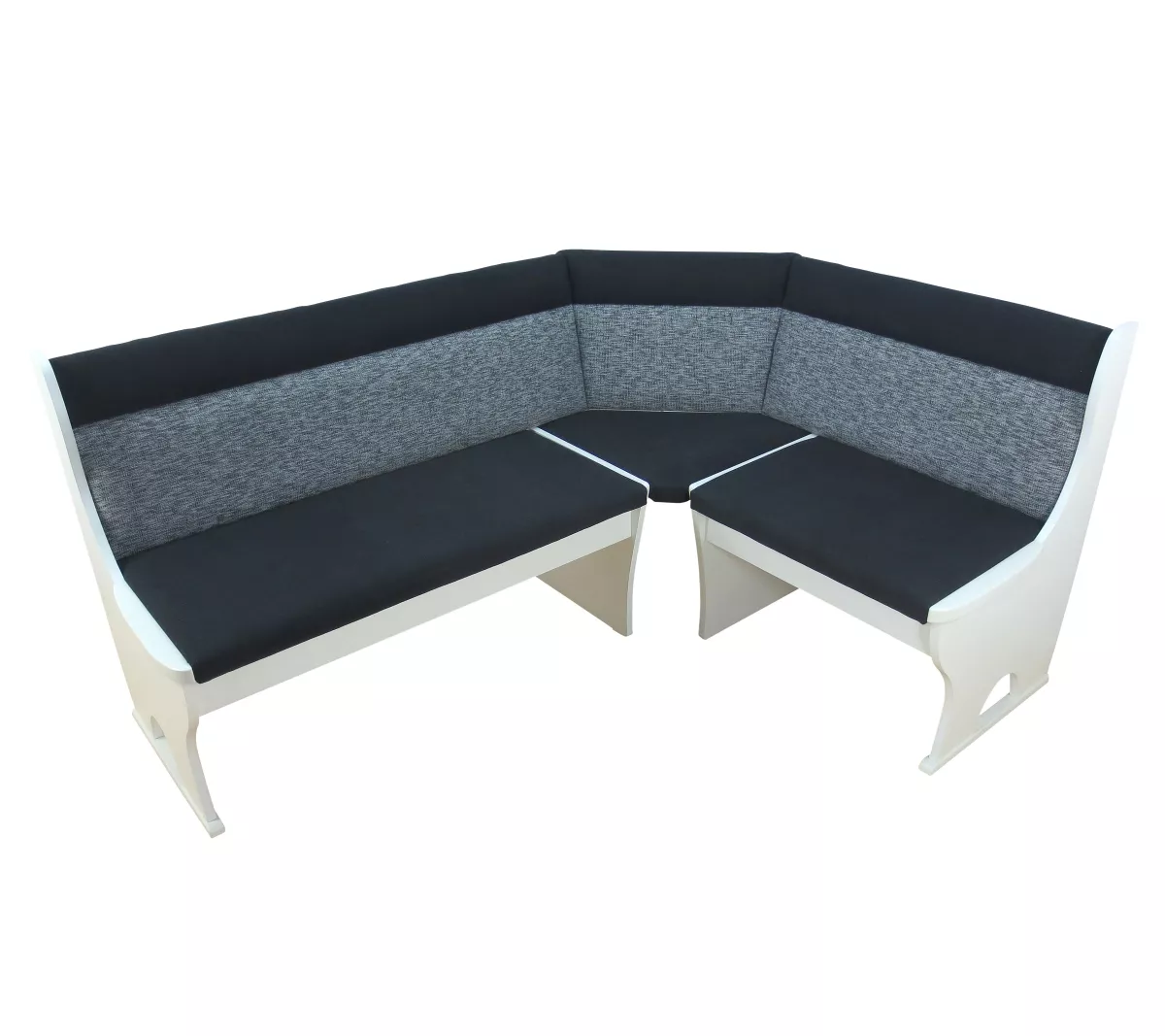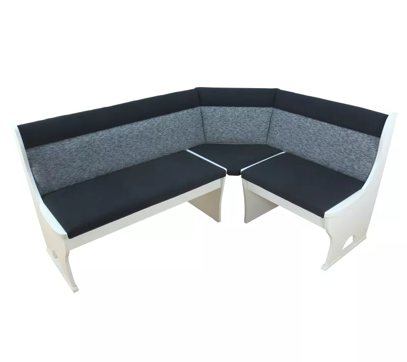 Die Eckbank besteht aus einer hochwertigen Materialkombination aus massiven Buchenholzelementen und melaminbeschichteten, pflegeleichten Weißflächen. Die Sitz- und Rückenkissen sind mit Qualitäts-Schaumstoff gepolstert, dekorativ gesteppt und mit strapazierfähigem Strukturstoff in Grau/Anthrazit bezogen.