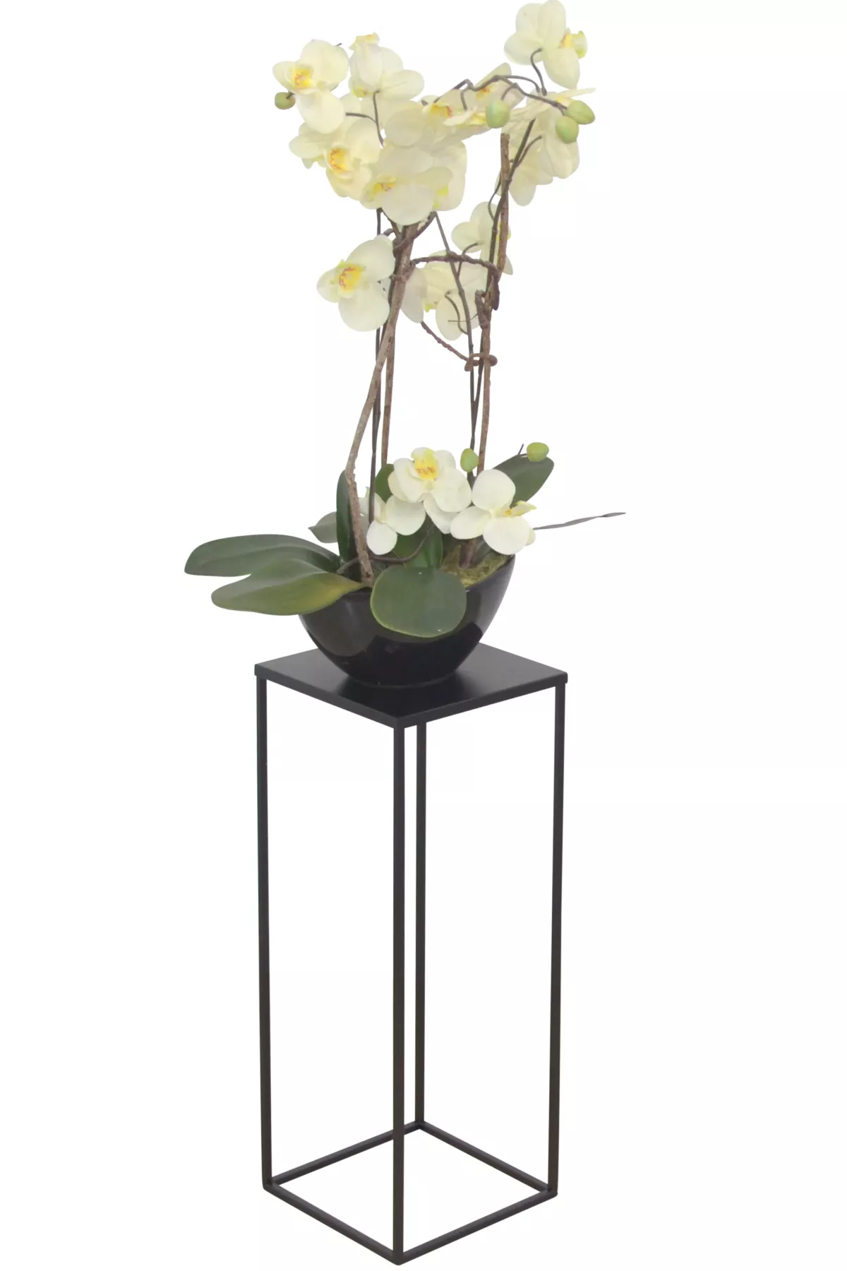 Moderner, viereckiger Blumenständer aus Metall, schwarz pulverbeschichtet. Oben eine Abstellfläche.