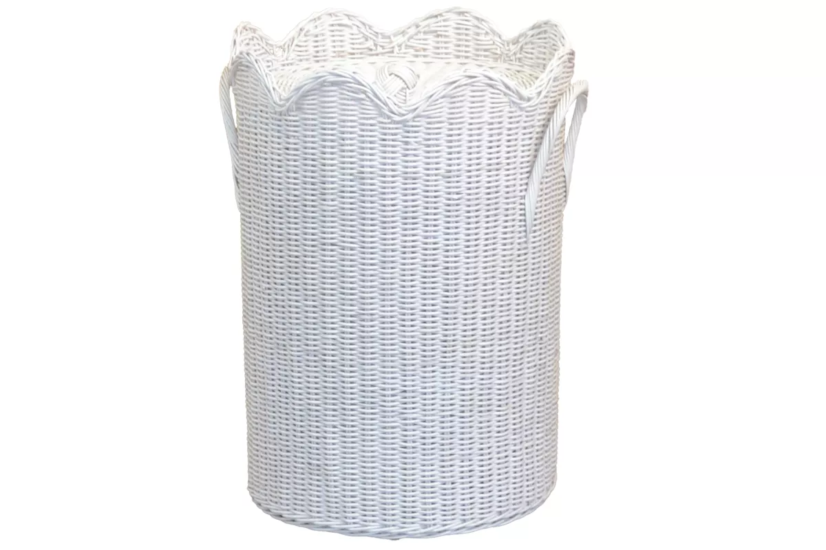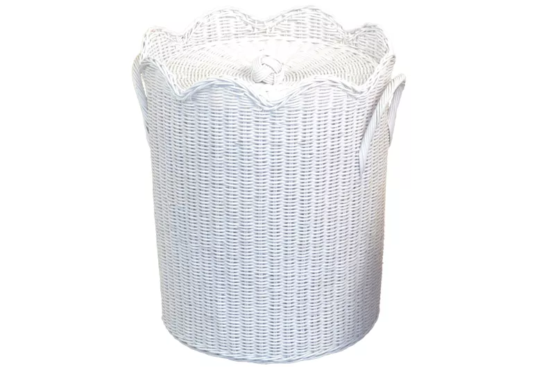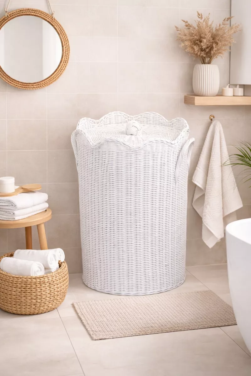 Dieser stilvolle Wäschesammler aus hochwertigem Rattangeflecht vereint natürliche Optik mit praktischer Funktionalität. Der komplett handgeflochtene Wäschekorb überzeugt durch seine stabile Verarbeitung und die elegante, weiß lackierte Oberfläche, die sich harmonisch in verschiedenste Wohnstile einfügt – von Landhaus bis modern.
