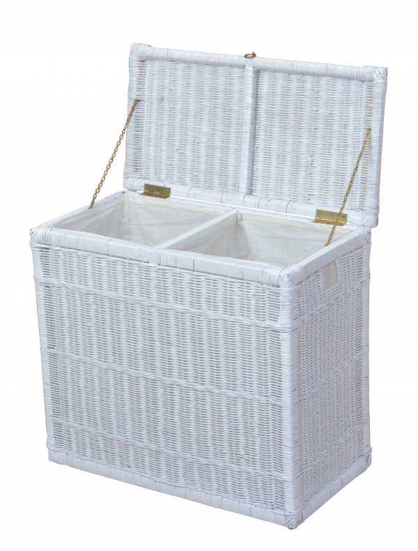 Unter dem aufklappbarem Deckel sind 2 Kammern für Schmutzwäsche.