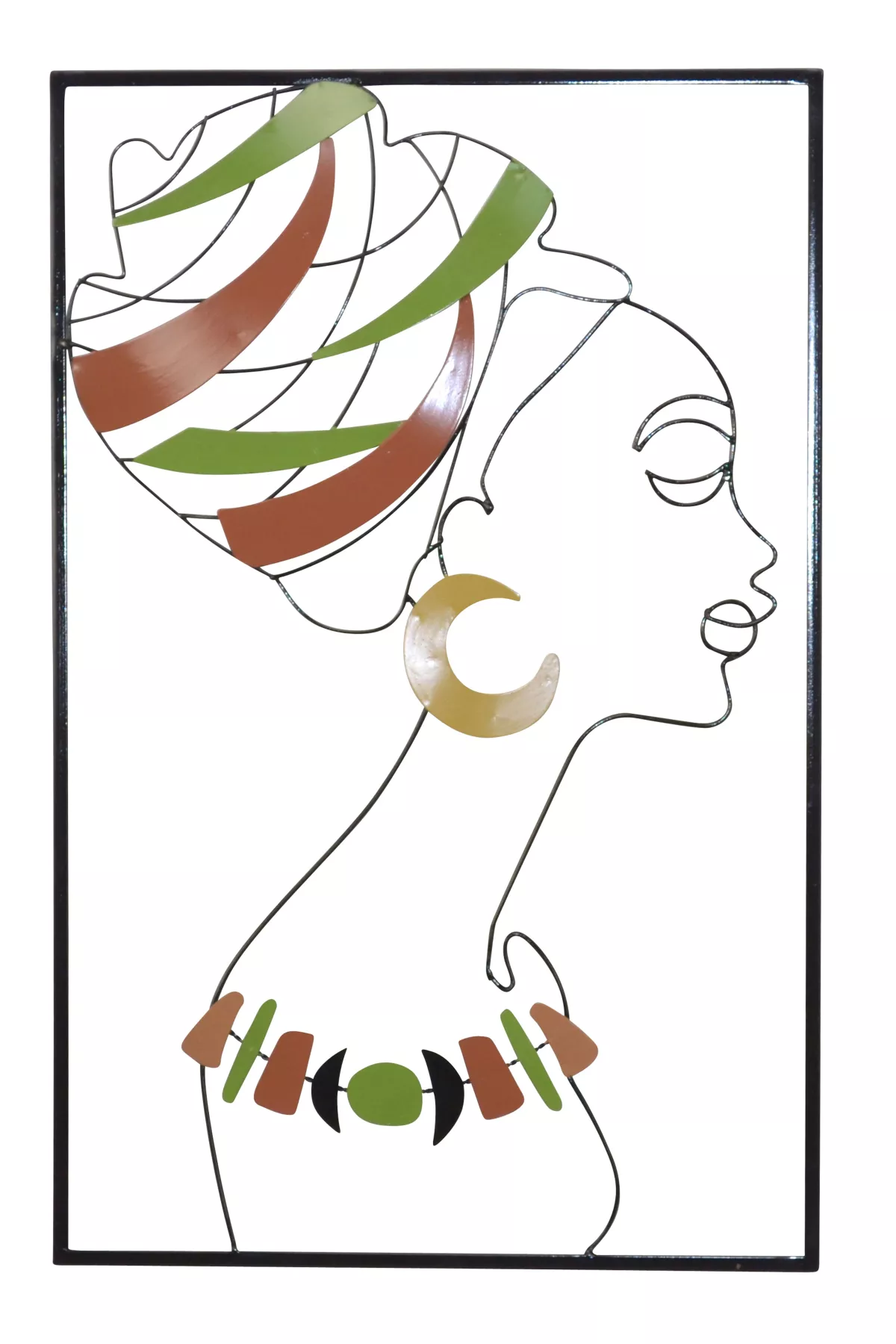Diese Wanddekoration aus Metall verleiht jedem Raum eine außergewöhnliche Note. Das kunstvolle Motiv einer afrikanischen Frau ist in einem schwarzen Metallrahmen eingefasst und begeistert durch seine filigrane Linienführung und harmonischen Farbakzente in Braun, Grün und Beige.