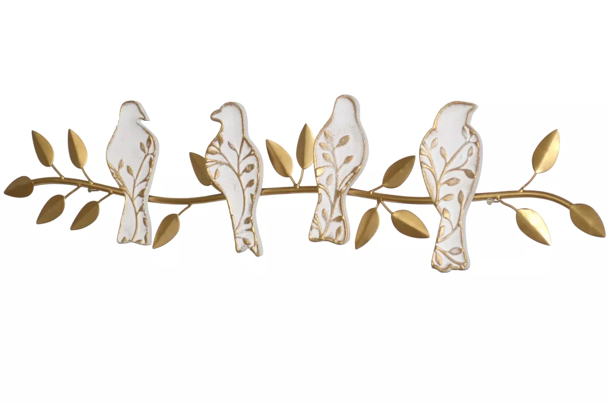 Diese wunderschöne Wanddekoration mit 4 Vögeln vereint natürliche Leichtigkeit mit edlem Design. Auf einem goldfarben lackierten Metallzweig sitzen vier zart cremeweiß lackierte Vögel aus MDF, die durch ihre goldfarben abgesetzte Umrandung besonders elegant wirken.