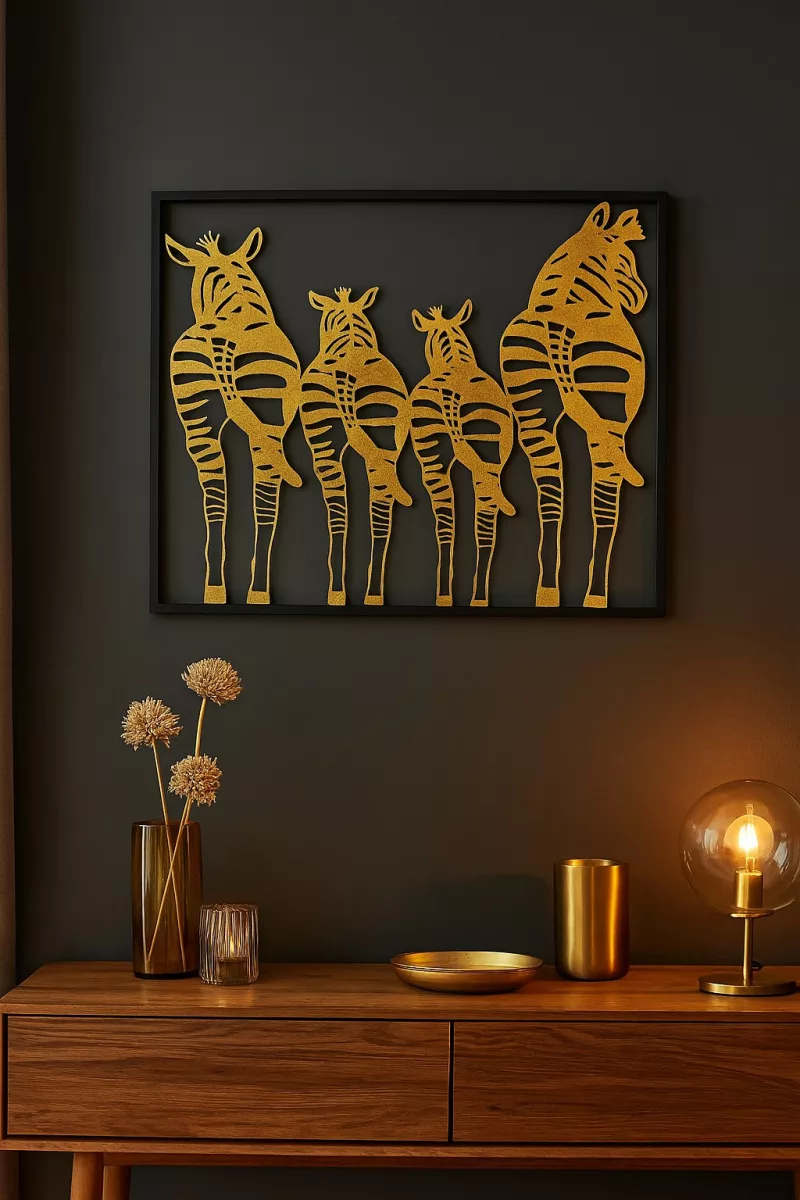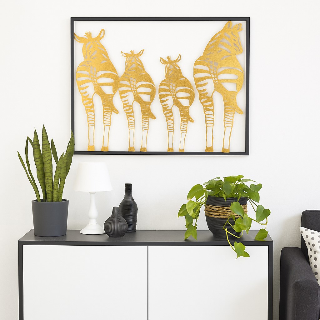 Diese außergewöhnliche Wanddeko aus Metall verbindet modernes Design mit natürlicher Eleganz. Die in warmem Gold lackierte Zebrafamilie wirkt lebendig und verleiht Ihrer Wand eine stilvolle, exklusive Note. Durch den schwarzen Metallrahmen entsteht ein harmonisches Zusammenspiel von Farbe und Form – perfekt für moderne und klassische Einrichtungen gleichermaßen.