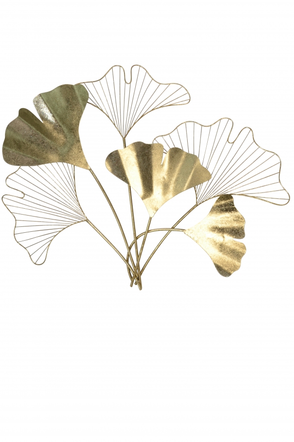 Wunderschöne Wanddekoration aus Metall in Form von vielen Ginkgo-Blättern, trendig goldfarben, beschichtet.