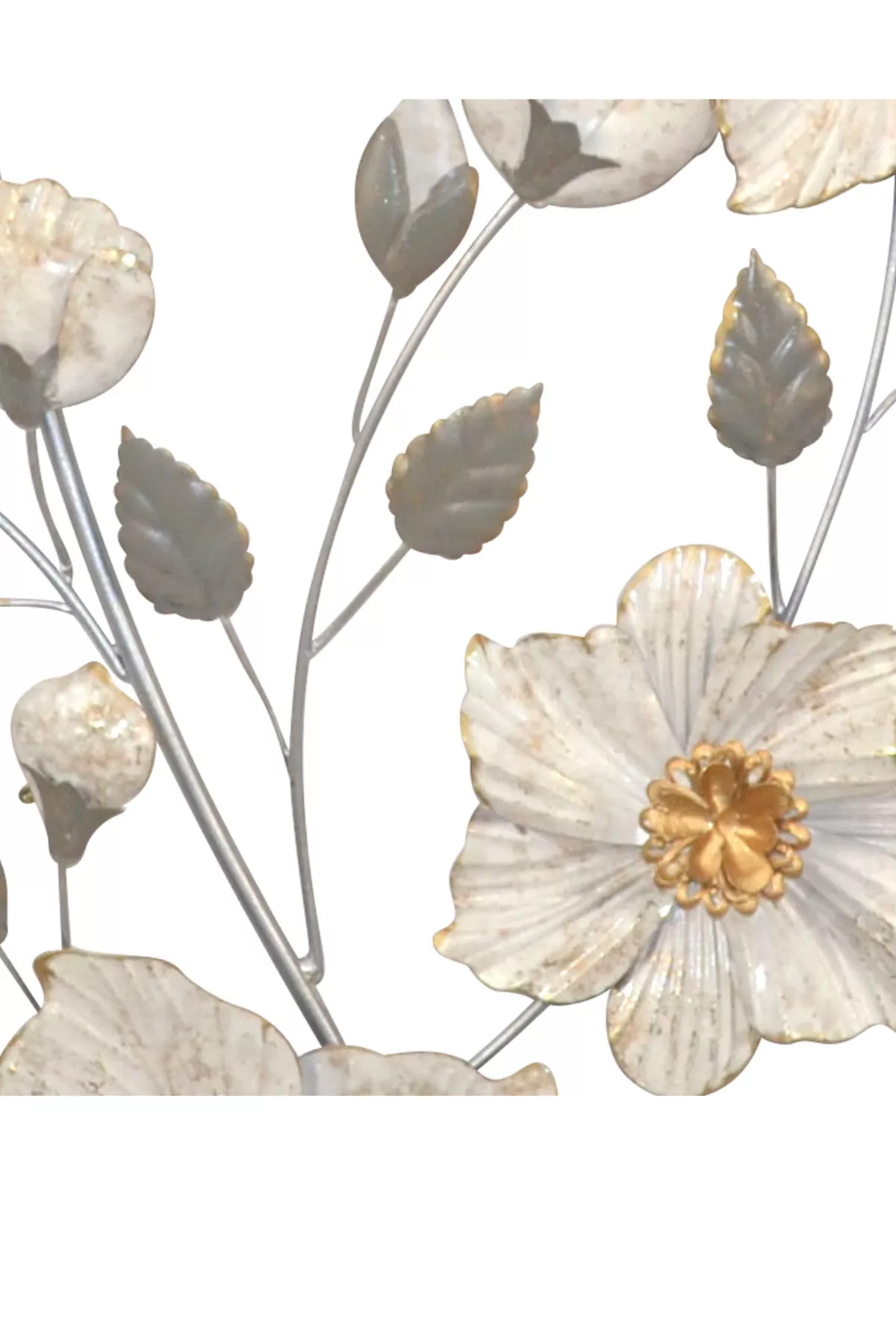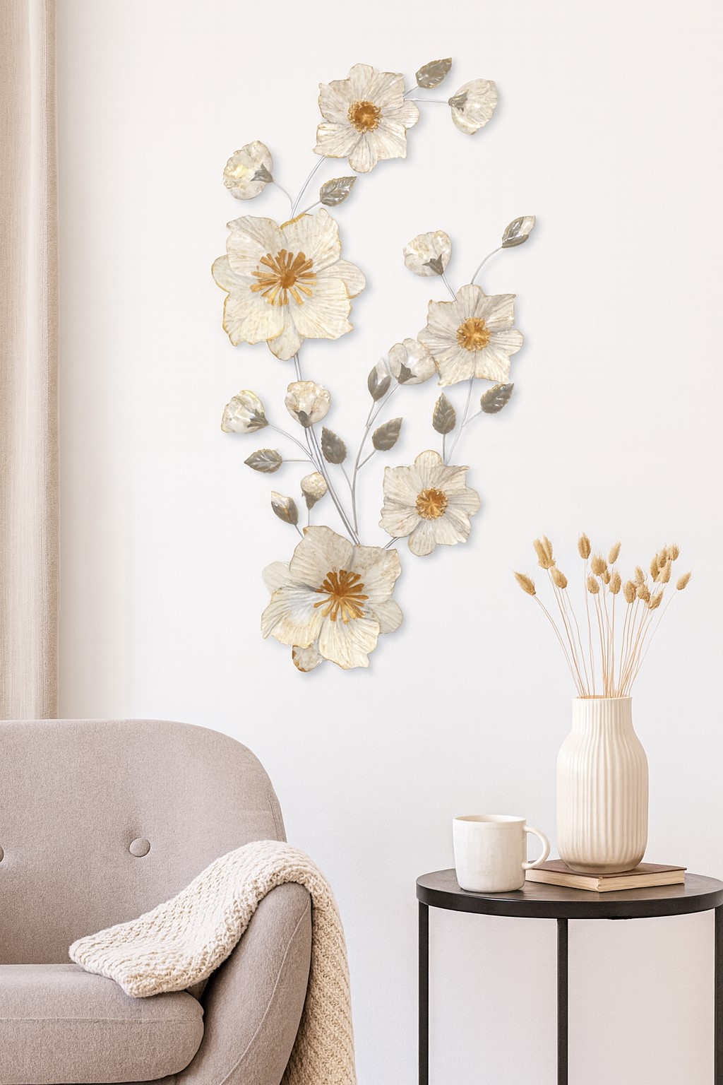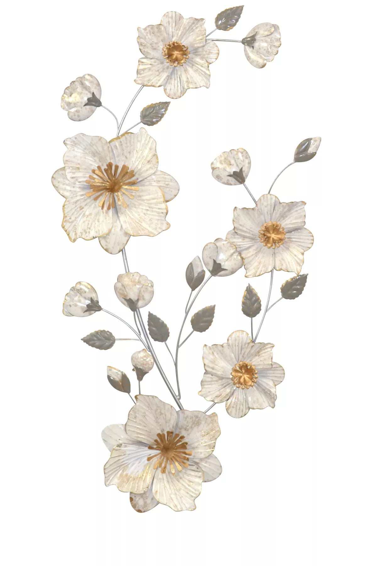 Diese exklusive Wanddekoration aus Metall bringt stilvolle Eleganz und natürliche Leichtigkeit in jeden Wohnraum. Die filigran gearbeiteten Blüten und Blätter sind in harmonischen Creme-, Grau- und Goldtönen lackiert und verleihen der Wanddeko eine edle, zeitlos moderne Ausstrahlung. Dank der praktischen Wandmontage lässt sich die Metallkunst einfach anbringen und sorgt im Handumdrehen für ein wohnliches Ambiente.