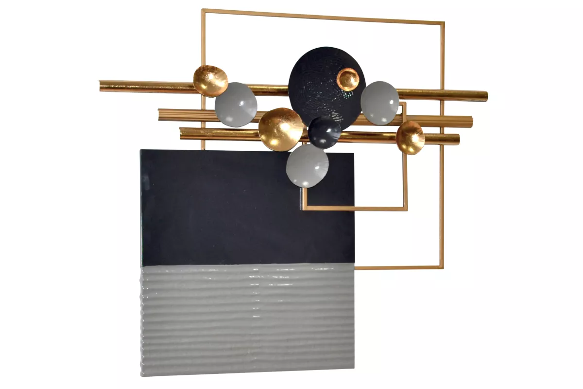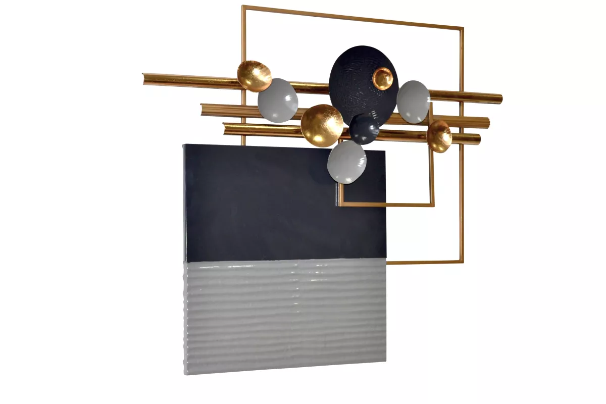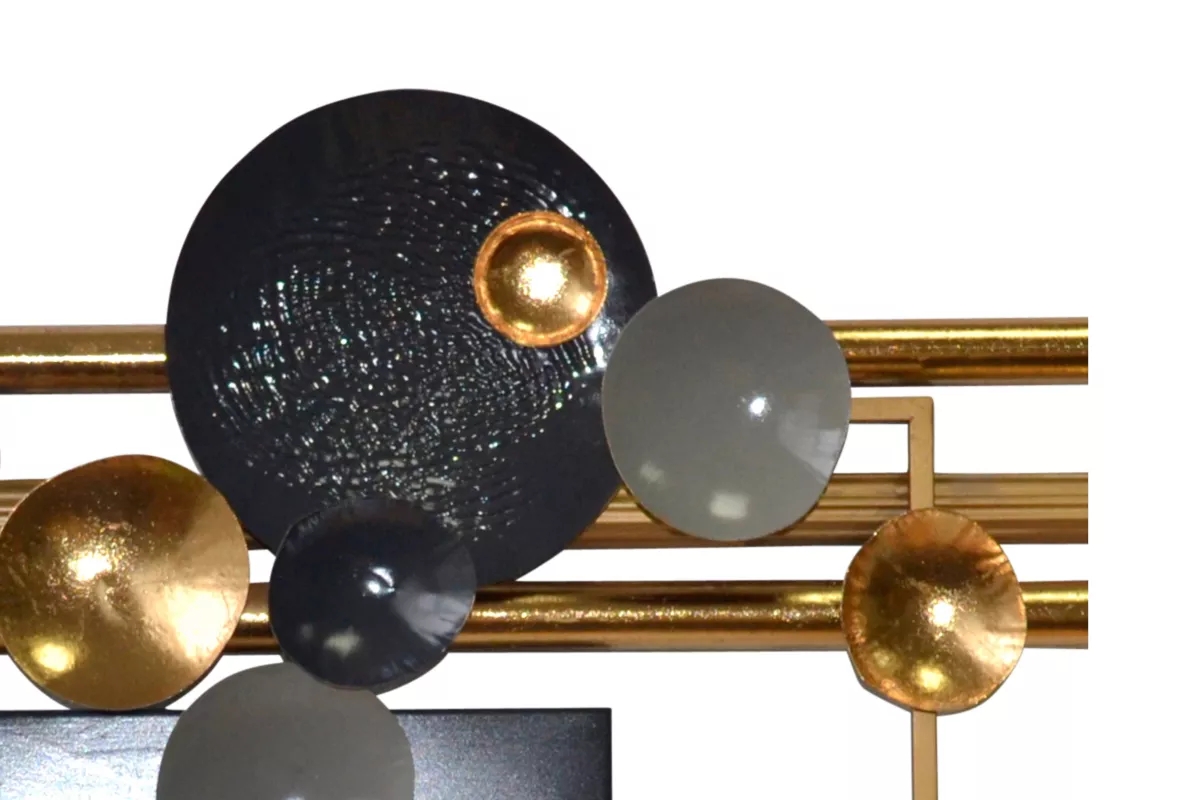 Diese moderne, große Wanddekoration aus Metall ist ein absoluter Hingucker für jedes Zuhause. Mit ihrer pflegeleichten, glatten Oberfläche und der harmonischen Kombination aus geometrischen Formen – Quadraten und Kreisen – zieht sie alle Blicke auf sich. Die edle Farbgestaltung in Grau, Schwarz und Gold verleiht dem Raum ein modernes und gleichzeitig elegantes Ambiente.
