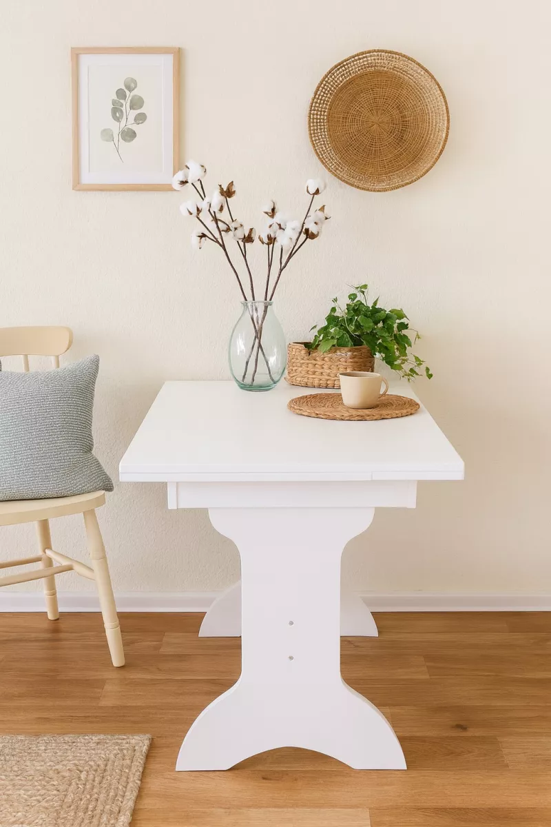 Der Wangentisch mit Auszugfunktion ist die perfekte Lösung für alle, die Flexibilität mit Design kombinieren möchten. Mit seiner klaren, modernen Formgebung und der hochwertigen, pflegeleichten Melaminbeschichtung in Weiß fügt sich dieser Esstisch mit Auszug harmonisch in jede Wohnumgebung ein – ob in der Küche, im Esszimmer oder im offenen Wohnbereich.